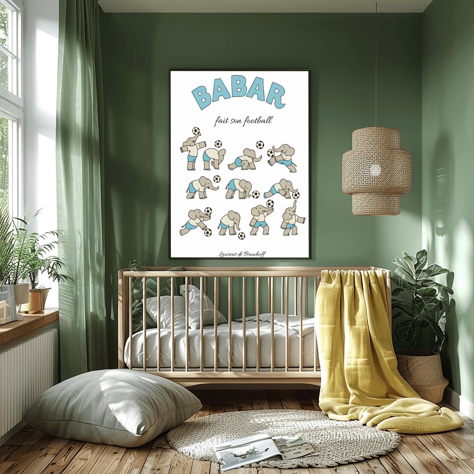 Babar fait son football Poster, Elephant Soccer Player Art, Cute French Nursery Decor, Kids Sports Print