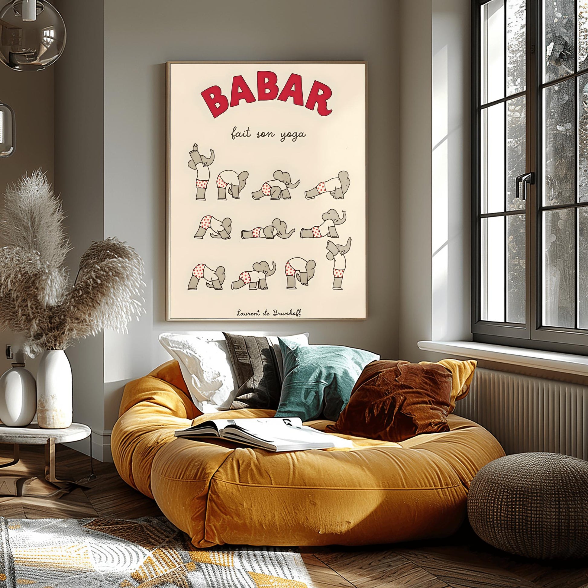 Babar the Elephant Does Yoga Print: Red Polka Dot Pants Retro Nursery Decor, Kids Room Art