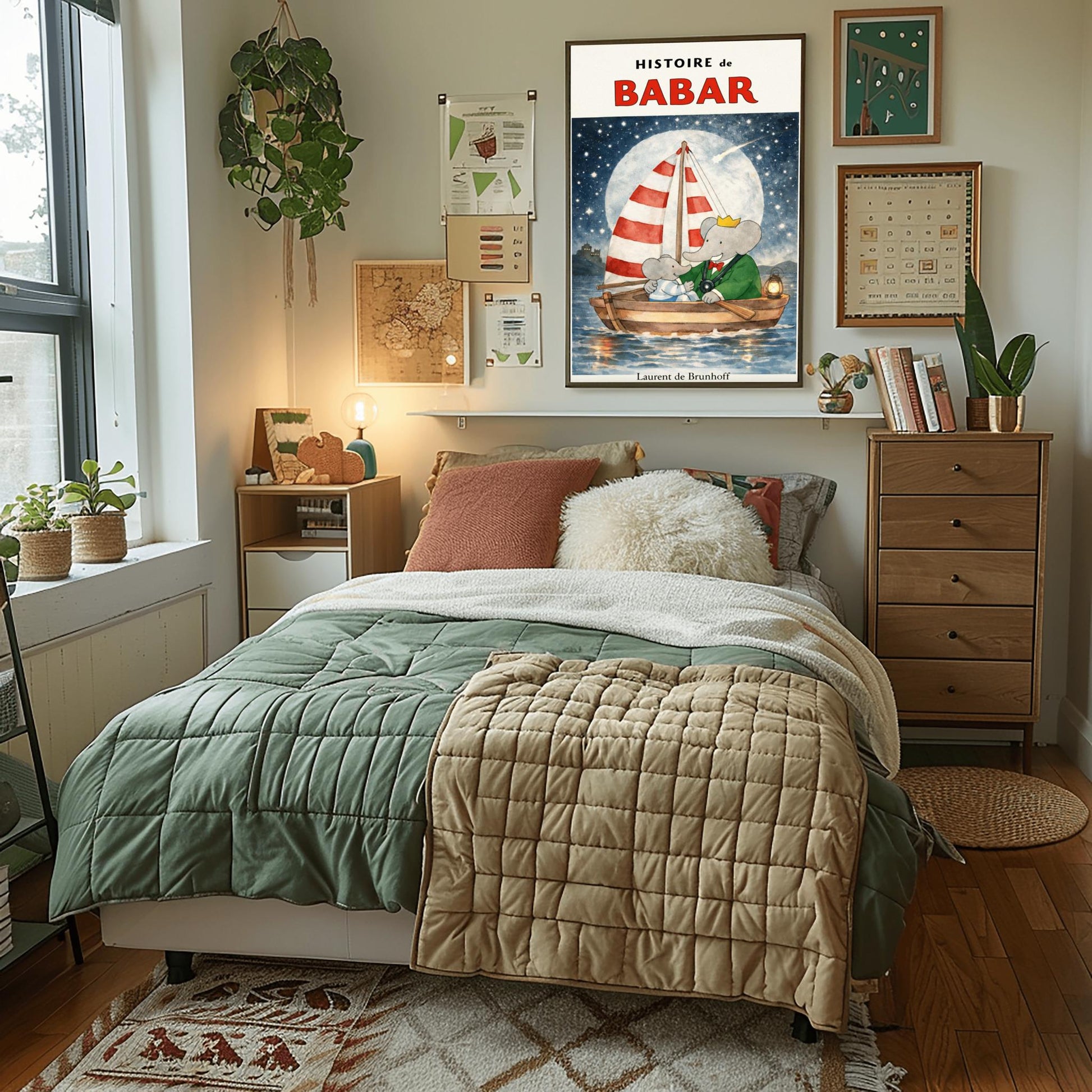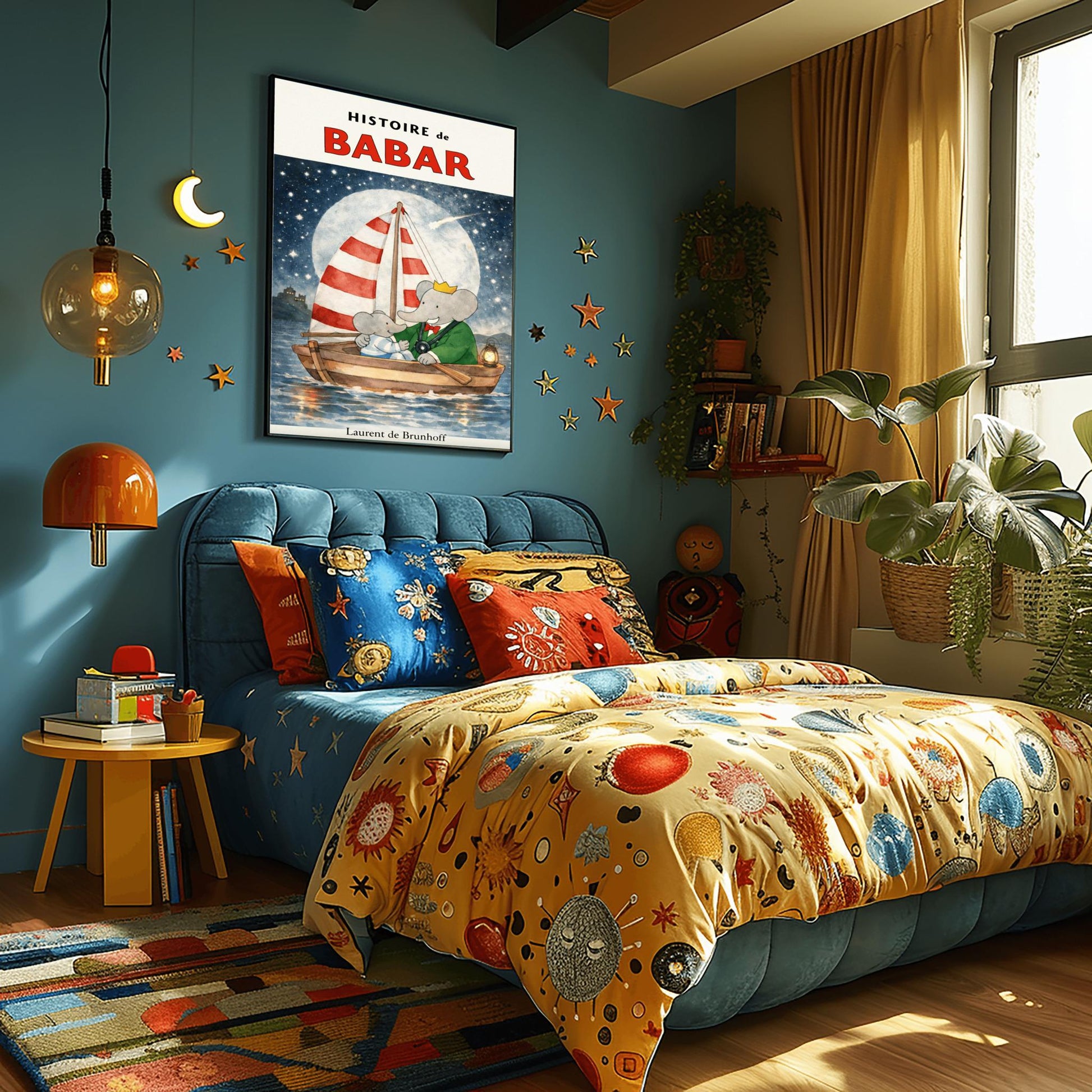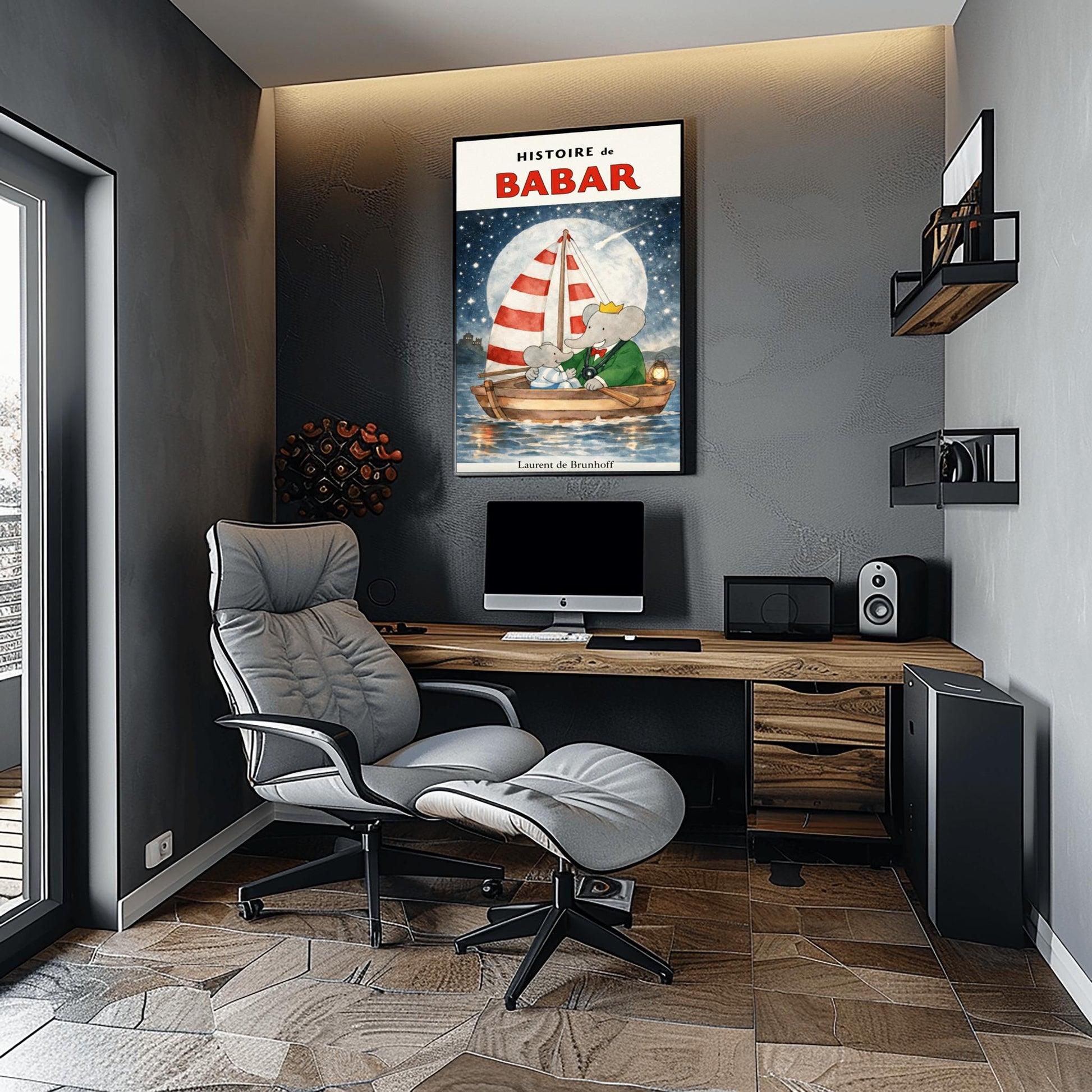 Set sail for the land of dreams with this enchanting "Histoire de Babar" poster. This atmospheric illustration captures King Babar and one of his little ones sharing a quiet, magical moment on a wooden sailboat, drifting across a shimmering sea under the glow of a magnificent full moon and a shooting star.With its striped red-and-white sail and a warm lantern lighting the way, this piece by Laurent de Brunhoff beautifully captures the wonder of the night sky. The deep navy blue tones, sprinkled with twinkling stars and a distant castle silhouette, create a peaceful and sophisticated aesthetic that brings a sense of calm to any child's sleeping space.✨ Why This Print is a "Dreamy" Addition: Perfect for Sleep Spaces: The soothing nighttime theme and deep blue palette make it an ideal focal point above a crib or bed to encourage sweet dreams.Magical Celestial Details: Features a large, textured moon and a shooting star, tapping into the popular "Outer Space" and "Night Sky" nursery trends.Sophisticated Watercolor Style: The soft blending of the water and sky offers a more refined, artistic look compared to standard cartoon decor.Timeless Storytelling: Captures the gentle, protective bond between Babar and his family, a hallmark of the Brunhoff legacy.🖼️ Product Information Museum-Quality: High-definition printing ensures the luminous glow of the moon and the delicate reflections on the water are perfectly preserved.Available Sizes: [e.g., 12x18, 18x24, 24x36].Premium Archival Paper: Printed on heavyweight, acid-free matte paper for a luxury finish that eliminates glare from nursery nightlights.🎁 A Gift for Midnight Dreamers An extraordinary choice for new baby gifts, christenings, or as a centerpiece for a nautical-themed nursery. This print is a timeless celebration of the adventures that wait for us, even in our dreams.