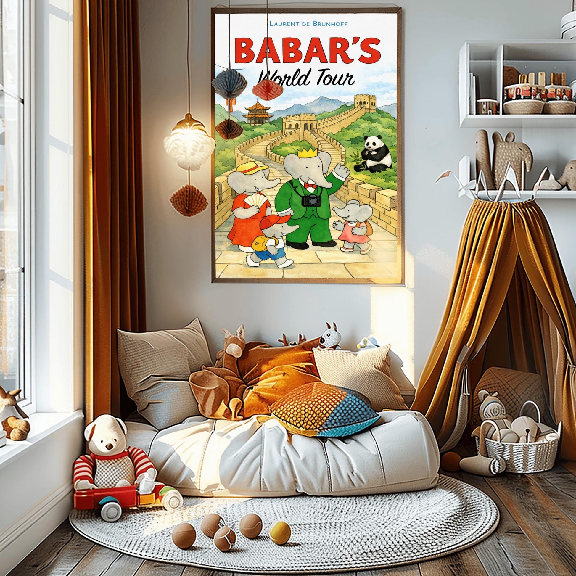 Pack your bags for an unforgettable journey with the "Babar's World Tour" collection. This delightful illustration features Babar, Celeste, and their little ones exploring the majestic Great Wall of China.Babar is ready for the perfect shot with his vintage camera, while the family takes in the breathtaking mountain scenery, traditional pagodas, and a friendly giant panda enjoying a bamboo snack. Illustrated in the classic Laurent de Brunhoff style, this piece blends the wonder of world history with the whimsical charm of the world's most famous elephant family.✨ Why This Print is a "World-Class" Addition: Iconic Landmark: Features one of the Seven Wonders of the World, making it a perfect educational and inspirational piece for a child's room.Vibrant Scenic Detail: The lush green hills, winding stone wall, and red lanterns add a pop of color and culture to any gallery wall.Whimsical Wildlife: The inclusion of a giant panda makes this an instant favorite for animal-loving kids.Global Explorer Theme: Encourages a sense of wonder and curiosity about different cultures and places, fitting perfectly with a "Little Traveler" nursery theme.🖼️ Product Information Museum-Quality: High-definition archival printing ensures the detailed stonework and soft watercolor landscapes are captured with stunning clarity.Available Sizes: [e.g., 12x18, 18x24, 24x36].Premium Archival Paper: Printed on heavyweight, acid-free matte paper for a luxury, glare-free finish that mimics an authentic vintage travel advertisement.🎁 A Gift for the Little Wanderer The perfect choice for multicultural families, travel enthusiasts, or as a unique birthday gift. This print is a beautiful reminder that the world is a big, wonderful place waiting to be explored.