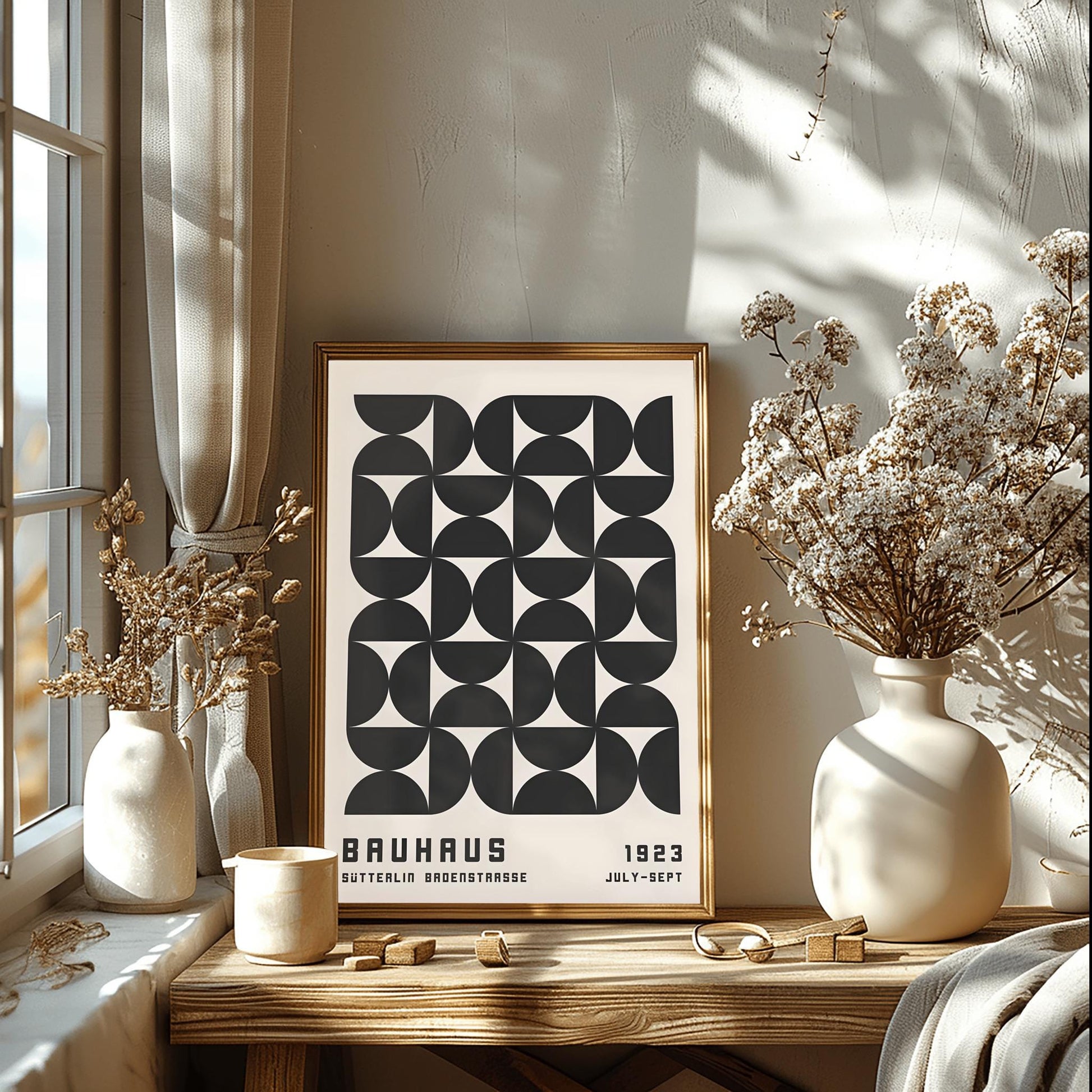 Elevate your interior with above bed art that brings history and style into your space. This physical bauhaus poster is a premium bauhaus print reproduction of the 1923 Bauhaus exhibition poster, crafted in captivating black shades that work with any modern home decor. The timeless geometric art and minimalist typography reflect true bauhaus wall art—clean lines and strong shapes that offer a minimalist art print feel for any room.This mid century modern and mcm wall art piece is perfect for creating a gallery look in your living room, office, or bedroom. It serves as striking retro vintage funky and aesthetic room decor, effortlessly pairing with either chic Art Deco or retro vintage print styles. More than simple decoration, this exhibition poster is a bold nod to the modernist movement, making your space feel curated and unique.Choose from our premium options to find the right fit for your home or office. Bring the essence of mid century modern and bauhaus wall art into your life with this geometric, minimalist print—perfect for anyone wanting modern home decor with a touch of retro vintage inspiration.