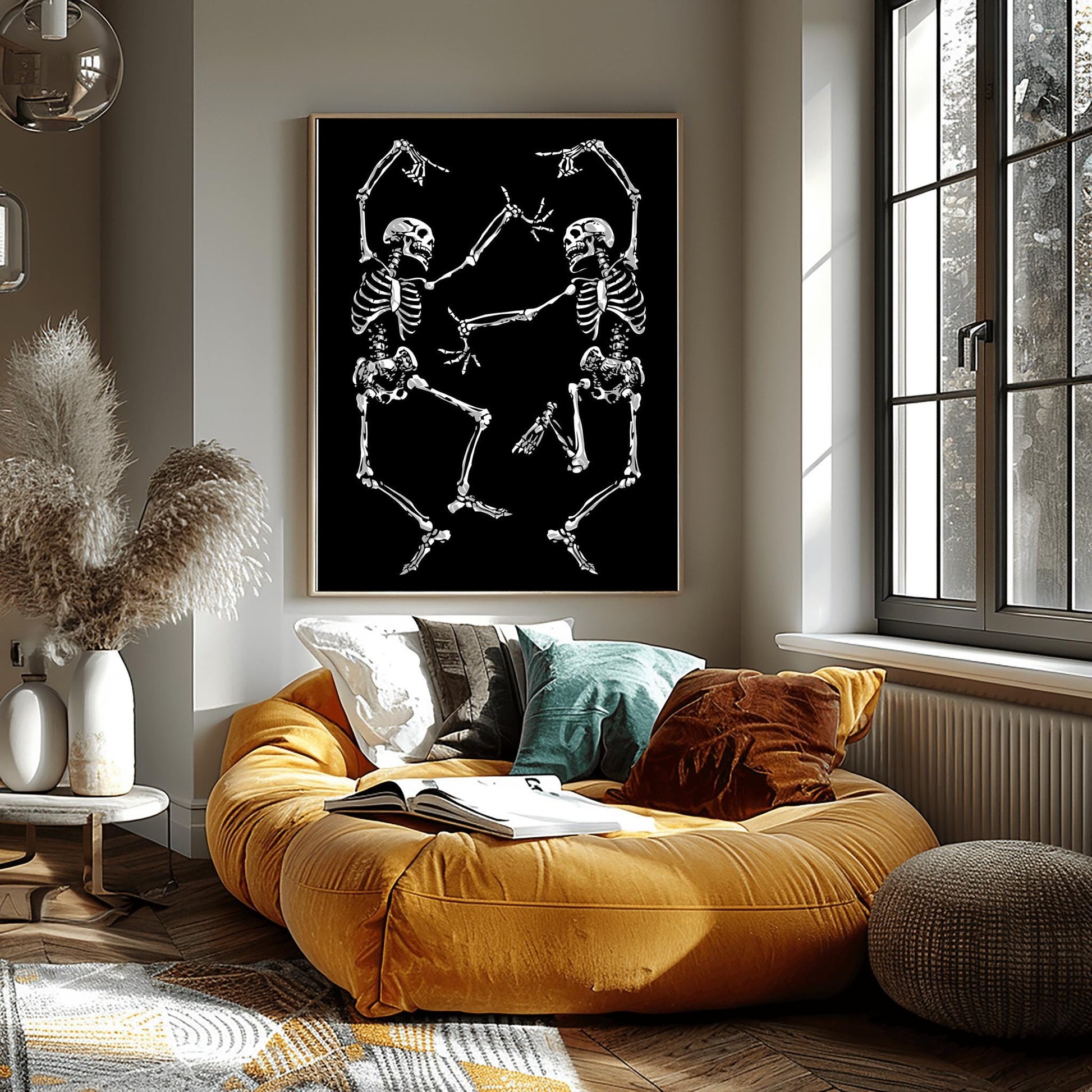 Unleash the spirit of the underworld with this bold and captivating physical poster print of dancing skeletons. This striking piece blends gothic wall art and halloween decor, featuring two intricately rendered skeletons in dynamic, mirrored poses—a mesmerizing death dance that captures the essence of spooky art and macabre decor. It's just right for expressing your unique halloween style or adding a touch of creepy chic year-round.