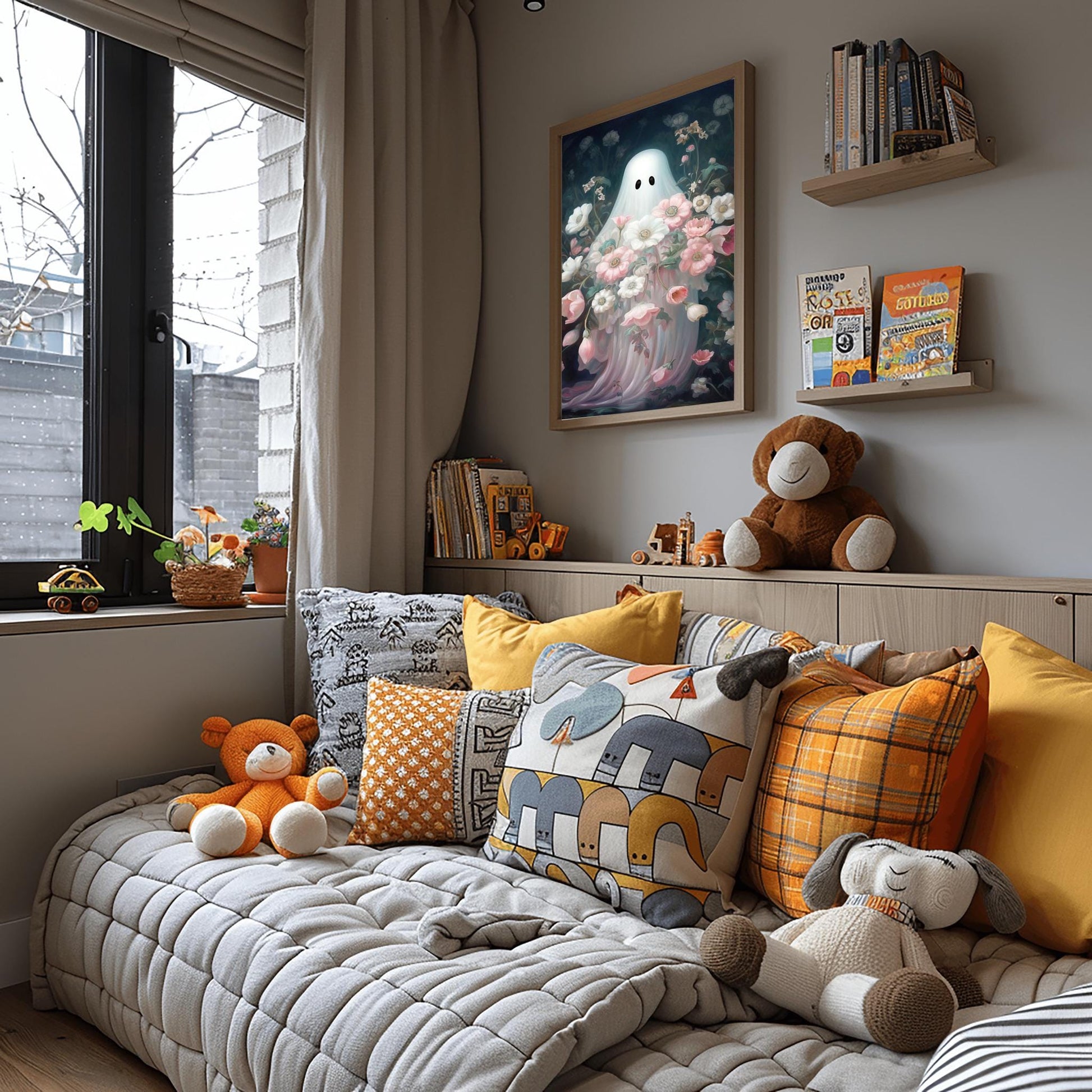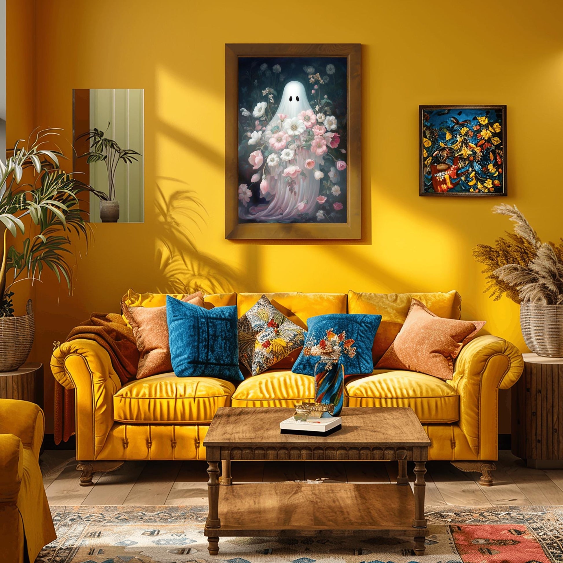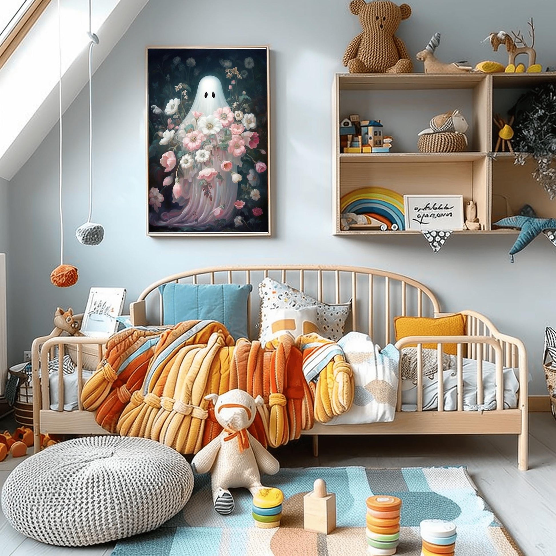 Printed on high-quality, durable poster paper, this physical poster ensures crisp details and rich, evocative colors that capture the original’s serene yet captivating mood. The unique and artistic subject matter makes it an ideal addition to any living room, bedroom, study, or gallery wall. Bring a distinctive and imaginative touch, especially suited for a haunted garden or as a thoughtful Halloween gift. Anyone who appreciates floral ghost art, ghostly figures, and spirit decor will love this pastel spooky poster.