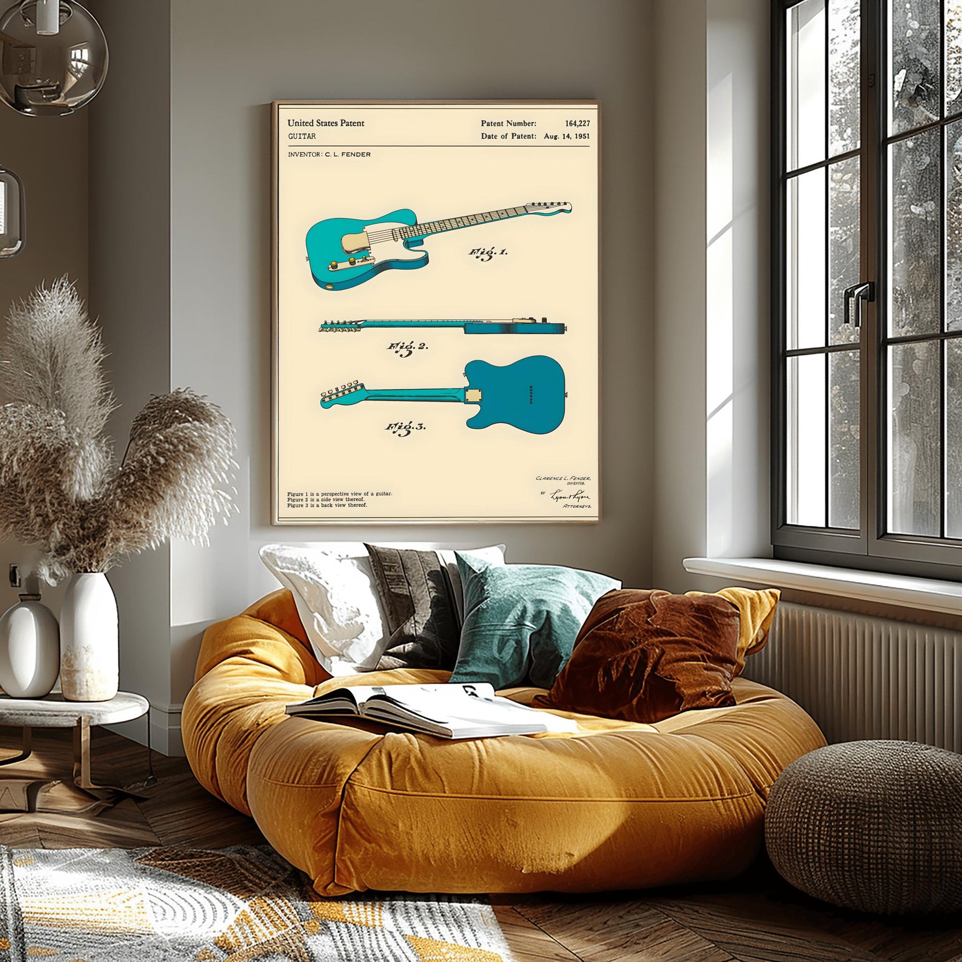 Celebrate the genius of guitar innovation with this striking fender guitar art patent print, showcasing the original 1951 design by Clarence L. Fender. This iconic 1950s guitar print features detailed blueprint wall art illustrations of the legendary electric guitar—an ideal rock music poster and retro music poster for music lover decor, musicians, and vintage design collectors.