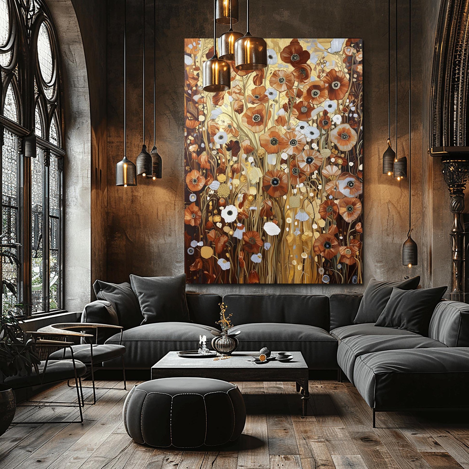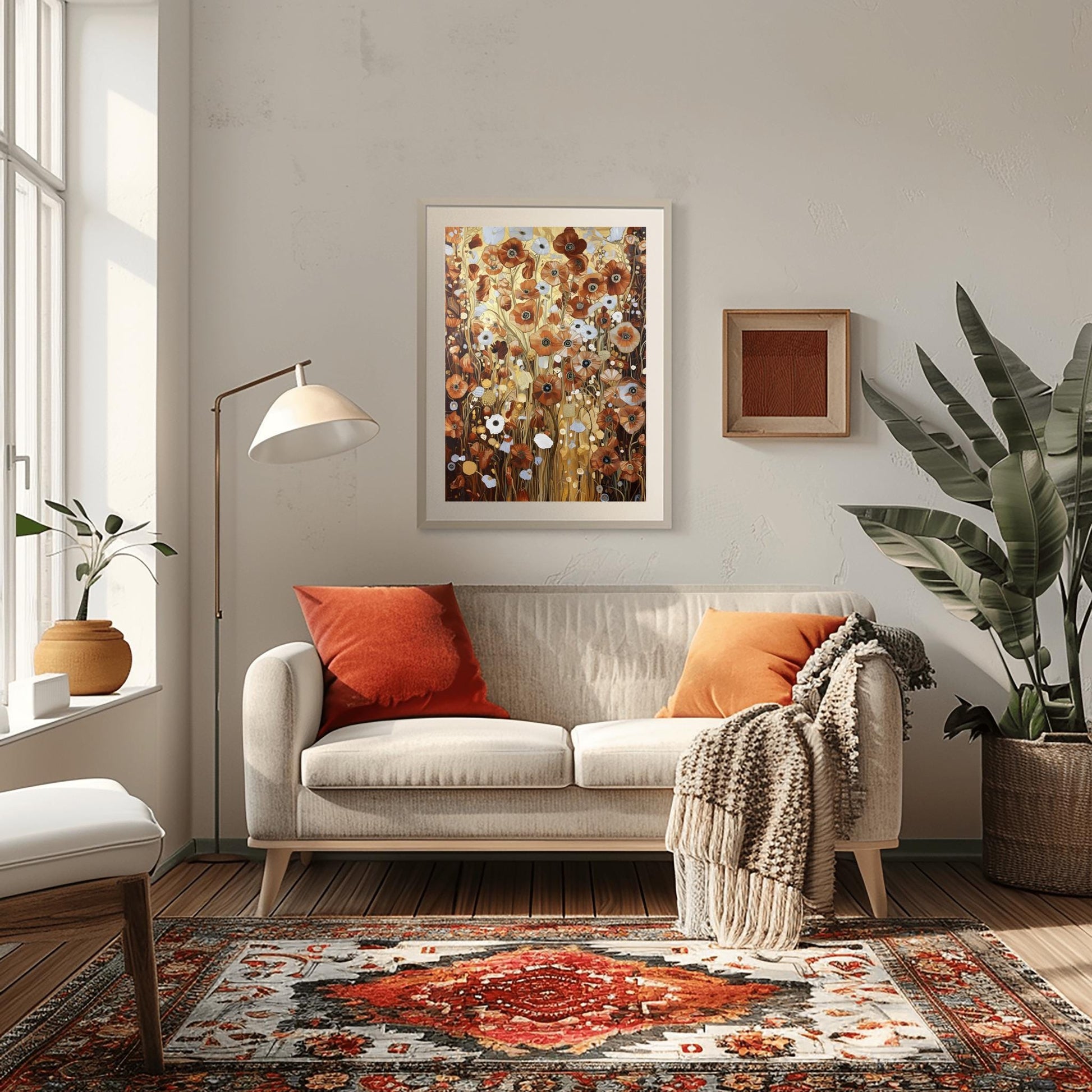 Inspired by the intricate detail and golden period of Gustav Klimt, this stunning Golden Poppy Meadow Print is a piece of art that demands attention.This high-quality physical poster features a complex tapestry of stylized flowers in warm, earthy tones of rust, deep brown, and terracotta, contrasted by bright white and silver accents. The entire scene is richly infused with shimmering gold and bronze textures, giving the impression of a genuine gold leaf painting. The dense composition and limited color palette create a sense of luxurious, moody abundance.This print is ideal for:Moody Maximalism: Perfect for dark walls or rooms seeking depth and texture.Luxury Interiors: The gold and rich colors elevate any space.Botanical Art Lovers: A highly unique and abstract interpretation of a poppy field.Printed on premium, durable paper, this physical art print beautifully reproduces the layered textures and the luminous golden tones of the original artwork, ready for framing.Features:High-Quality Physical Print: Ready for framing and built to last.Klimt-Inspired Style: Features dense composition and rich golden elements.Earthy & Golden Palette: Dominated by browns, rust, gold, white, and silver.Rich Texture Detail: Captures the multi-layered look of paint and metallic accents.