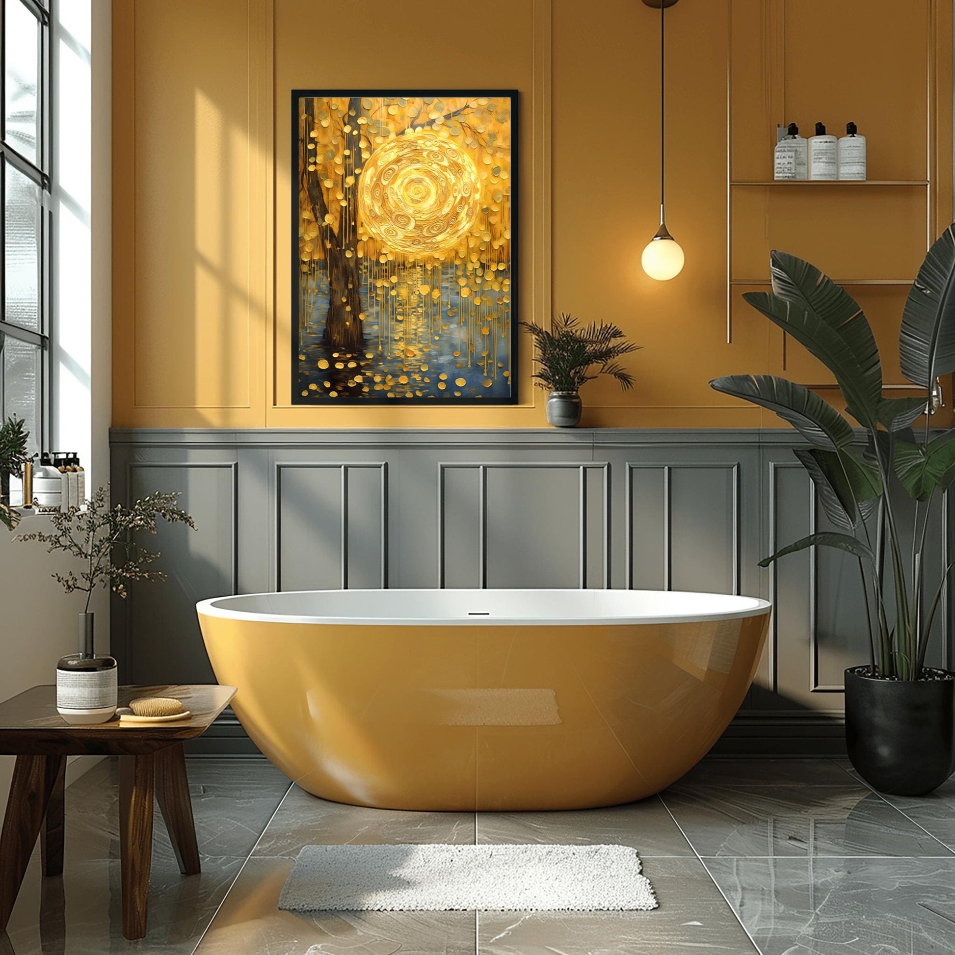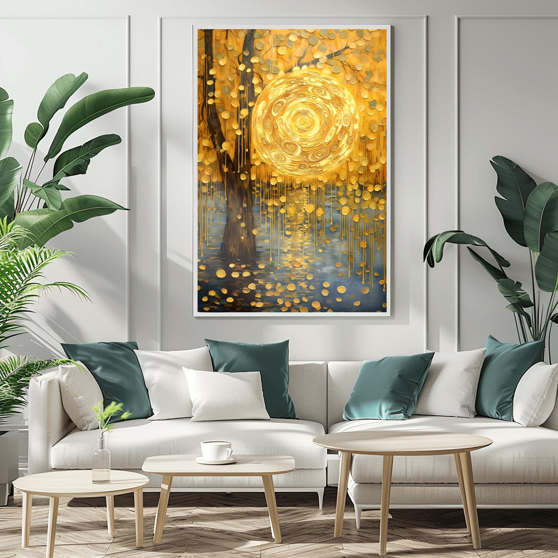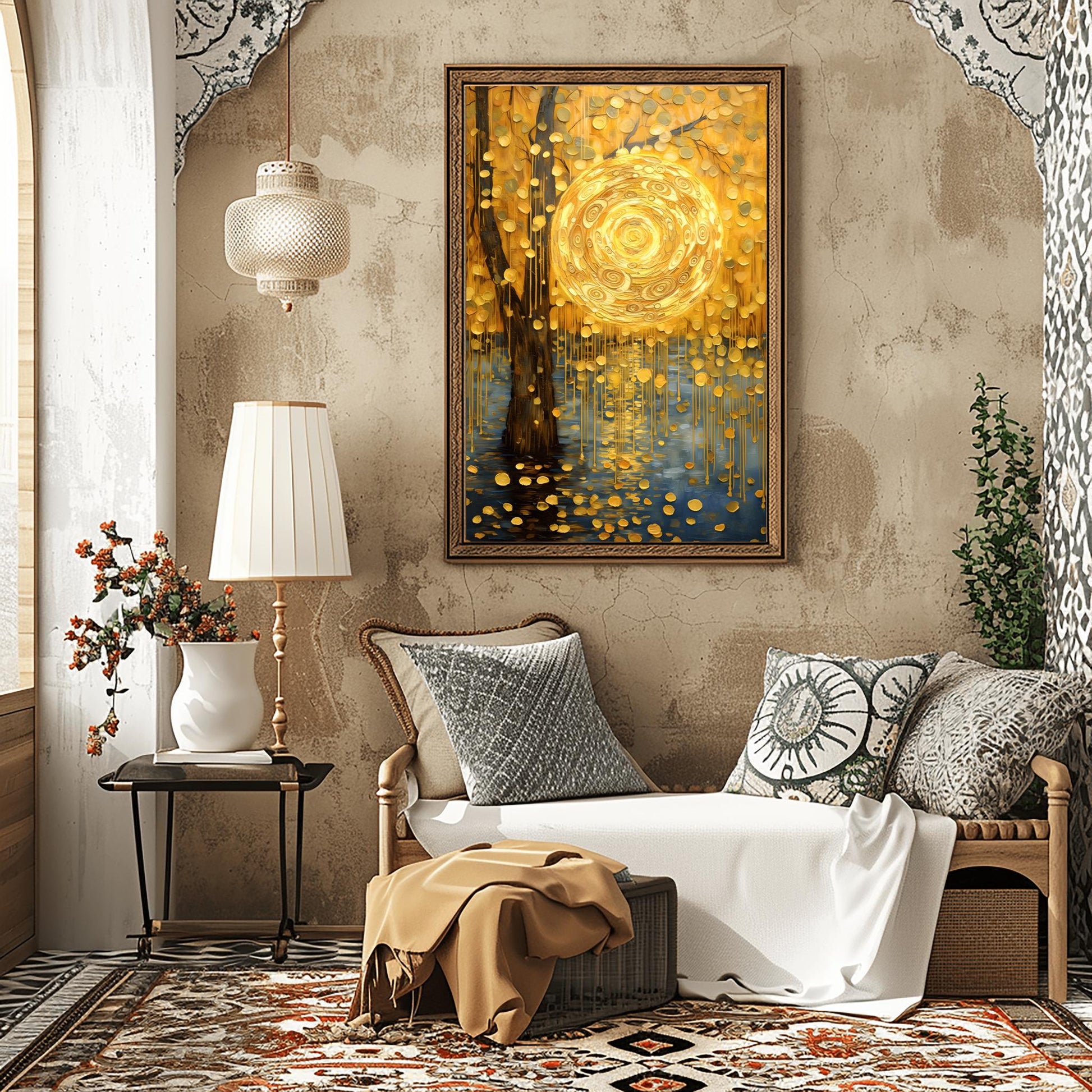 Maximalist or Bohemian Decor: The rich colors and intricate details are perfect for adding a touch of Bring a touch of classic artistry and vibrant color to your home with this stunning Gustav Klimt 'The Golden Tree' poster print. This high-quality physical print is a tribute to the artistry of the famous Austrian Symbolist painter. The artwork features a magnificent tree with golden, abstract leaves that seem to float on a shimmering, watery surface. The large, golden sun with its swirling patterns dominates the composition, creating a truly unique and captivating piece. The vibrant, repeating patterns and bold colors are characteristic of Klimt's work and the Vienna Secession movement.