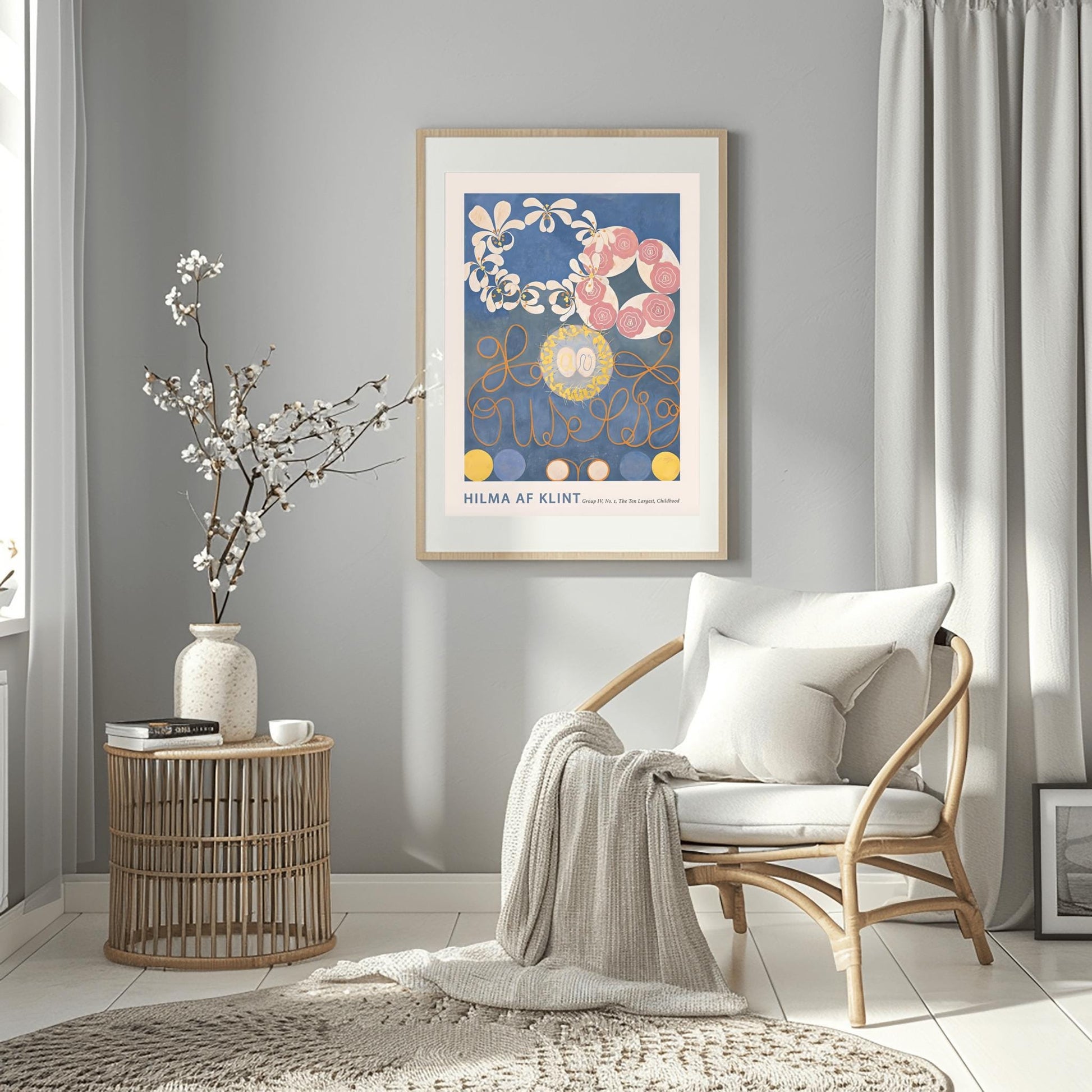 Discover the beauty and deep spiritual energy of Scandinavian art history with this Hilma af Klint print. This piece is a detailed reproduction of the iconic "The Ten Largest, No. 1" from 1907, highlighting Hilma af Klint’s groundbreaking vision in spiritual abstract and modern art. The ten largest print showcases the abstract composition that defined Hilma af Klint’s work—a delicate balance of color, form, and symbolic shapes that evoke a sense of inner calm.