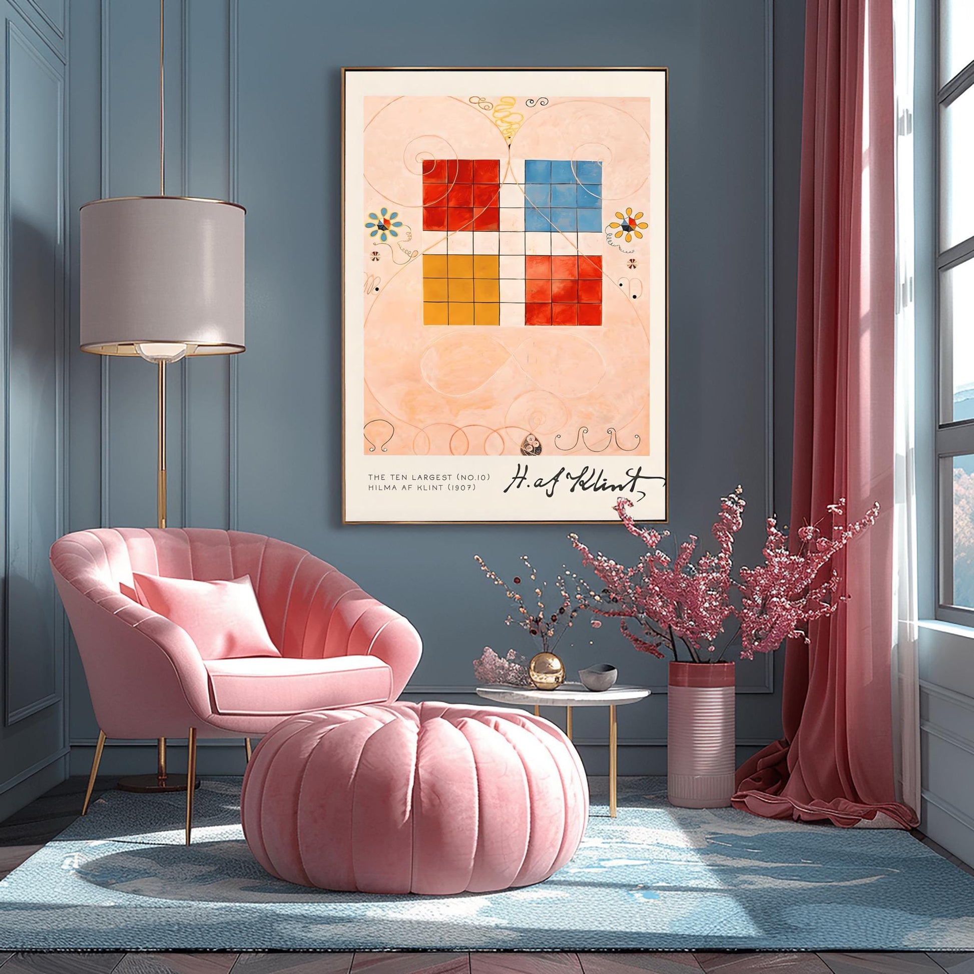 Discover the beauty and spiritual depth of art history with this Hilma af Klint print—an exquisite hilma klint poster capturing the essence of early Scandinavian art. This piece is a faithful reproduction of Hilma af Klint No 10, part of her iconic series, "The Ten Largest." Created in 1907, this ten largest print stands as a foundational klint painting in both spiritual painting and abstract composition. Hilma af Klint’s visionary style, rooted in her deep spiritual beliefs, shines through in this spiritual abstract work, featuring a soft lavender background, a delicate pink flower, and whimsical abstract shapes.