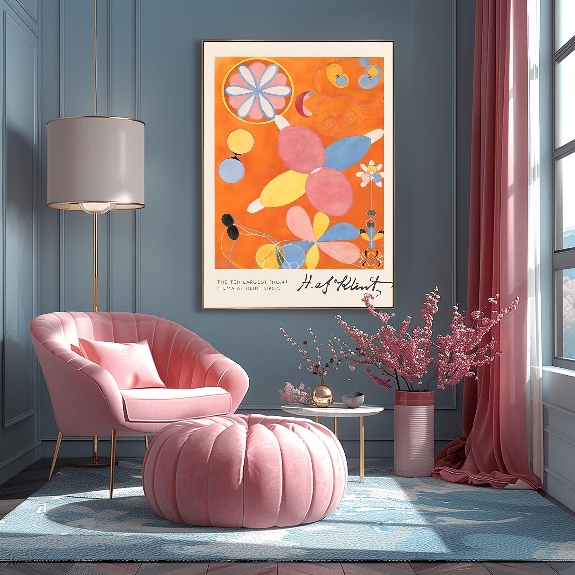 Discover the beauty and spiritual depth of Scandinavian art history with this exquisite Hilma af Klint print! This hilma klint poster is a faithful reproduction of Hilma af Klint’s "The Ten Largest, No. 4" from 1907, an iconic af klint print and a foundational klint painting in the evolution of abstract composition and spiritual abstract works. Hilma af Klint art is known for blending spirituality and innovation, and this ten largest print beautifully expresses her unique vision with its soft, lavender background, delicate pink flower, and whimsical abstract shapes.