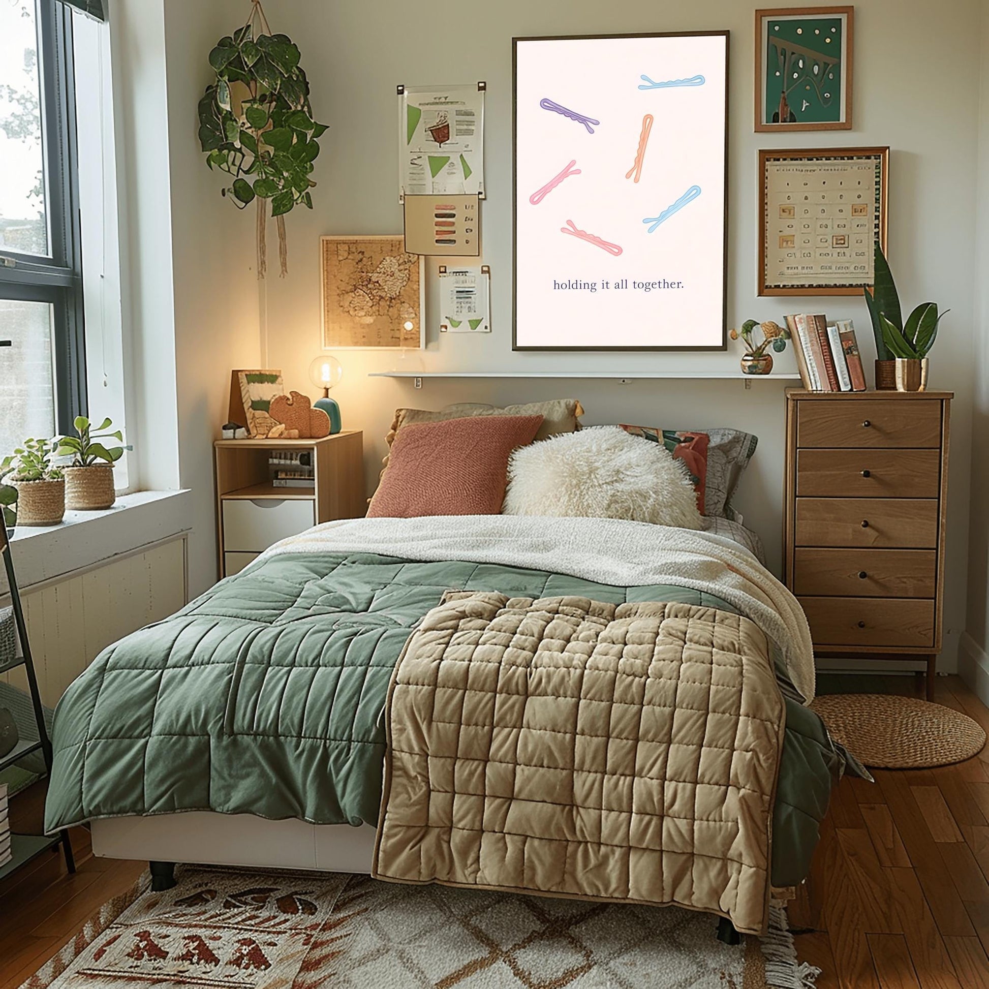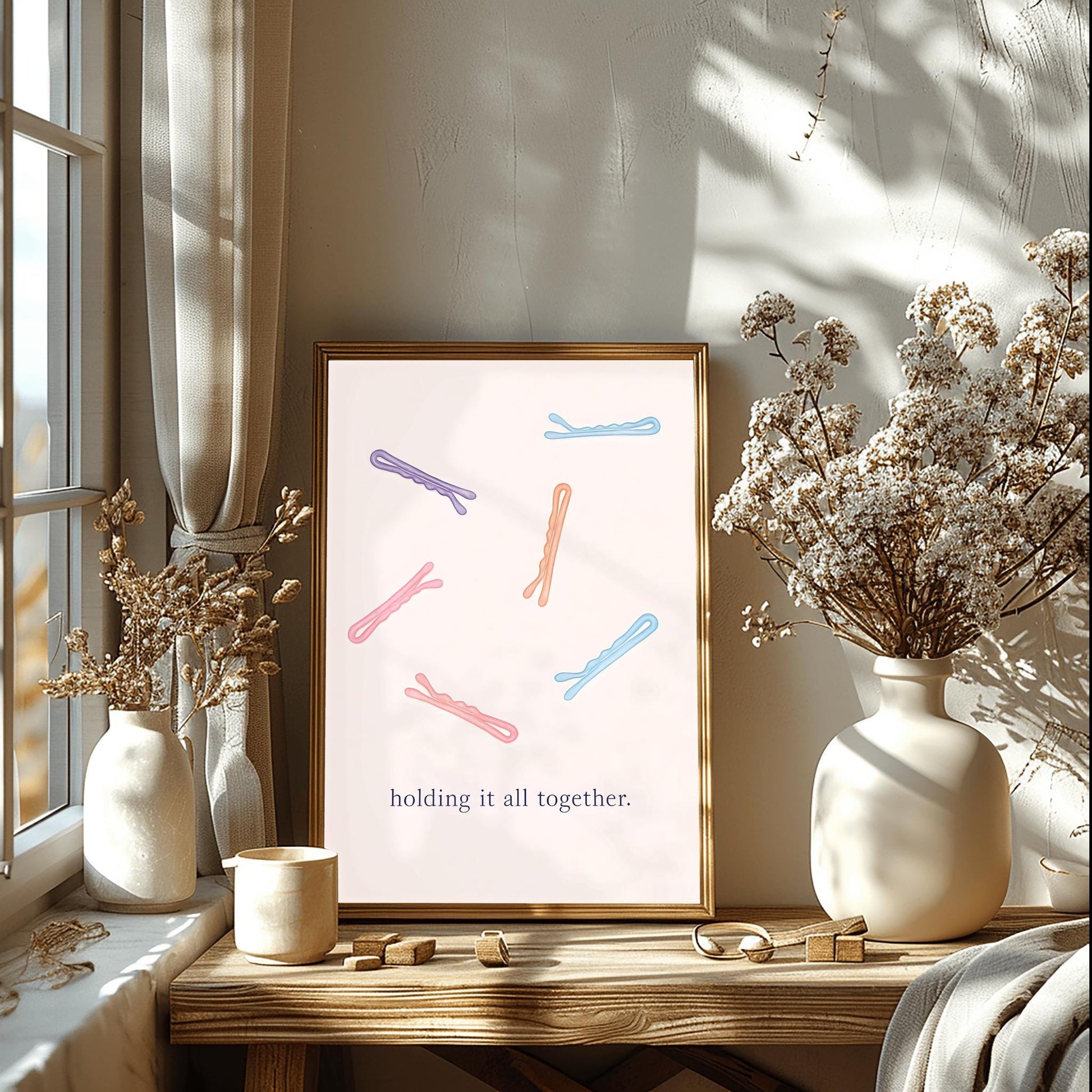 Bring a bit of humor and motivation to your routine! This chic hairpin art poster showcases six scattered bobby pins in soft, pastel tones paired with the phrase "holding it all together"—making it a clever encouragement gift or motivational gift. Whether you display it in your bathroom, by your vanity, or in a dressing room, this versatile typography wall art brings both style and a reminder of resilience to your daily life.