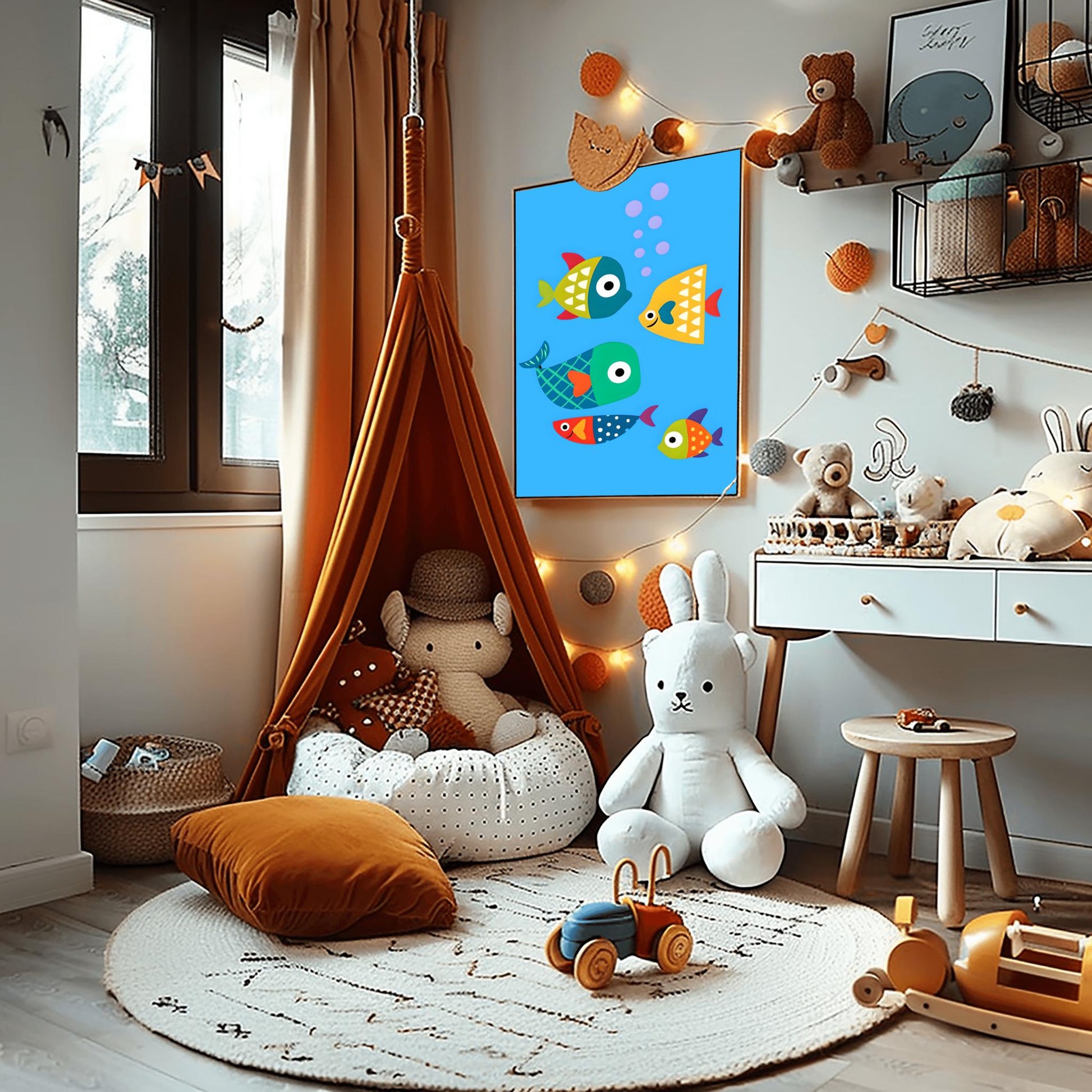 Dive into a world of fun with this adorable fish poster, designed especially for kids room decor! This high-quality physical print brings the magic of underwater art to your nursery wall art collection, making it a great fit for nurseries, playrooms, or any baby room art setup. The artwork showcases five playful fish, each one a vibrant cartoon fish print, swimming among cute sea animals on a bright blue background. The cheerful design and lively colors spark curiosity and encourage imagination, helping your child’s space feel engaging and happy.
