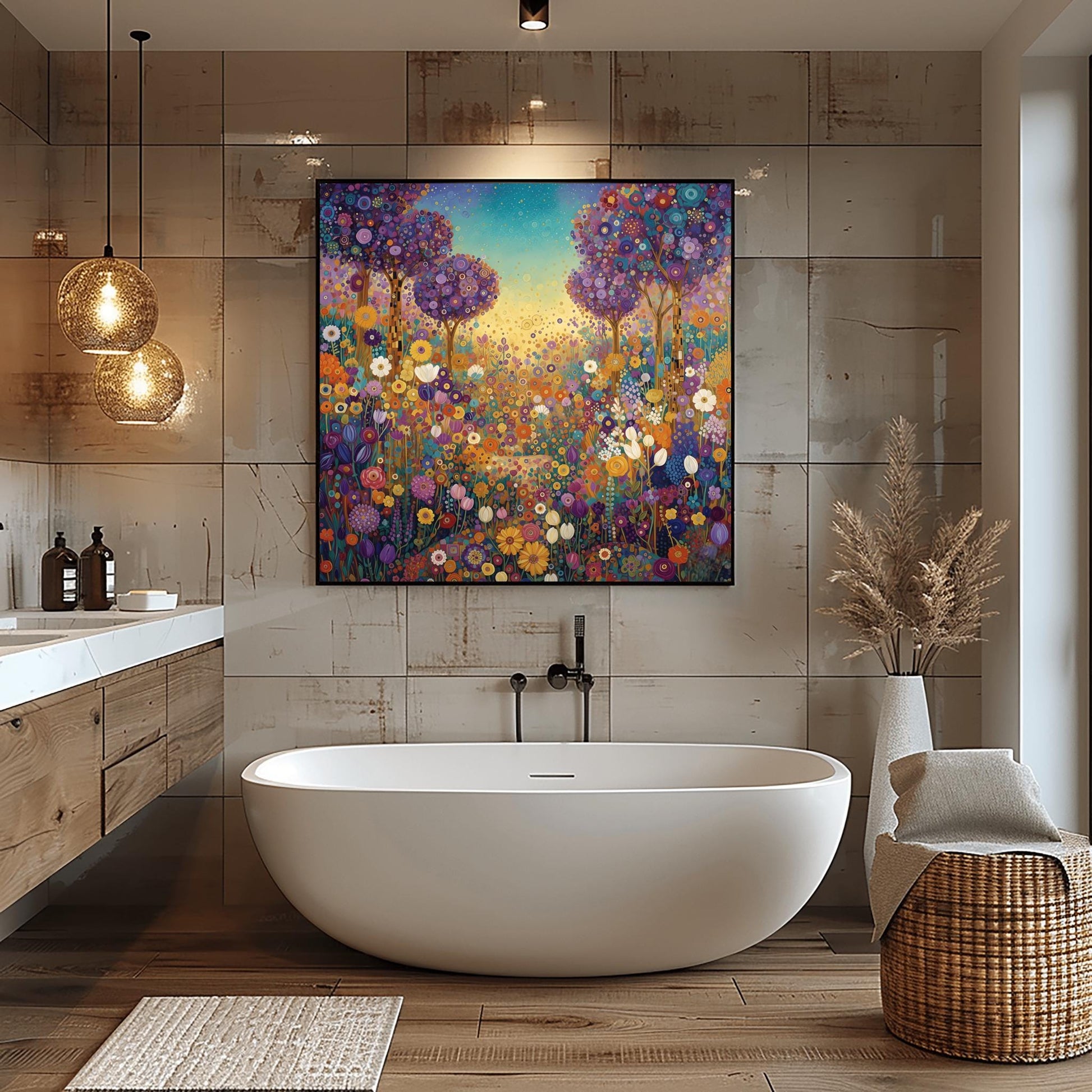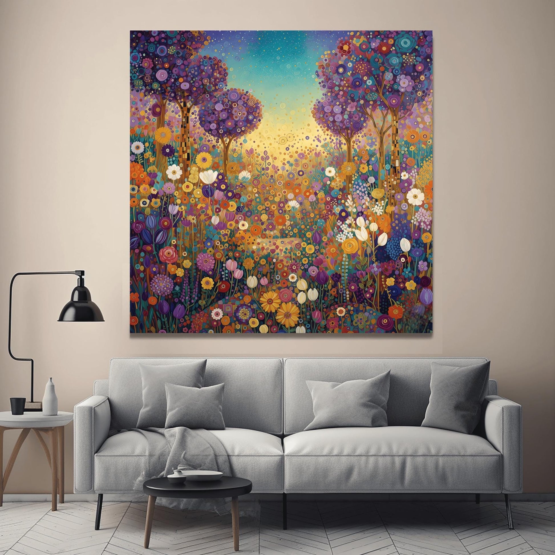 Klimt Whimsical Floral Meadow Print, Abstract Purple Tree Art, Vibrant Garden Landscape Poster