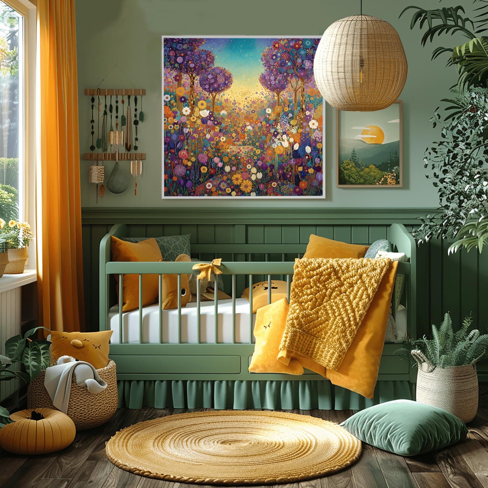 Dive into a world of pure, decorative delight with this magnificent Klimt Whimsical Floral Meadow Print. This high-quality physical print is a vibrant interpretation of Gustav Klimt's later landscape masterpieces, known for their flattened perspective and incredible density of color.The composition features a lush field of abstract flowers in every shade of the rainbow—pinks, oranges, blues, and purples—surrounding a small, sunlit central clearing. Flanking the scene are two large, stylized trees with crowns composed of clusters of purple circles, reminiscent of Klimt's symbolic patterning. The vibrant color and intricate detail make this a powerful, joyful piece of Art Nouveau-inspired decor.This print is ideal for:Maximalist Design: The density of color and pattern makes it the ultimate statement wall focal point.Klimt and Abstract Art Fans: A modern and highly colorful take on the Golden Period aesthetic.Creative Spaces: Perfect for infusing a studio, living room, or bedroom with energy and wonder.Printed on premium, durable paper, this physical art print is ready for framing and is guaranteed to be a conversation starter.Features:High-Quality Physical Print: A vivid, detailed poster ready to be framed and displayed.Klimt-Inspired Masterpiece: Features stylized trees and a densely packed, abstract floral foreground.Intense Color Palette: Dominated by purples, yellows, and oranges for a stunning, cheerful effect.Durable Premium Paper: Ensures long-lasting color and detail.