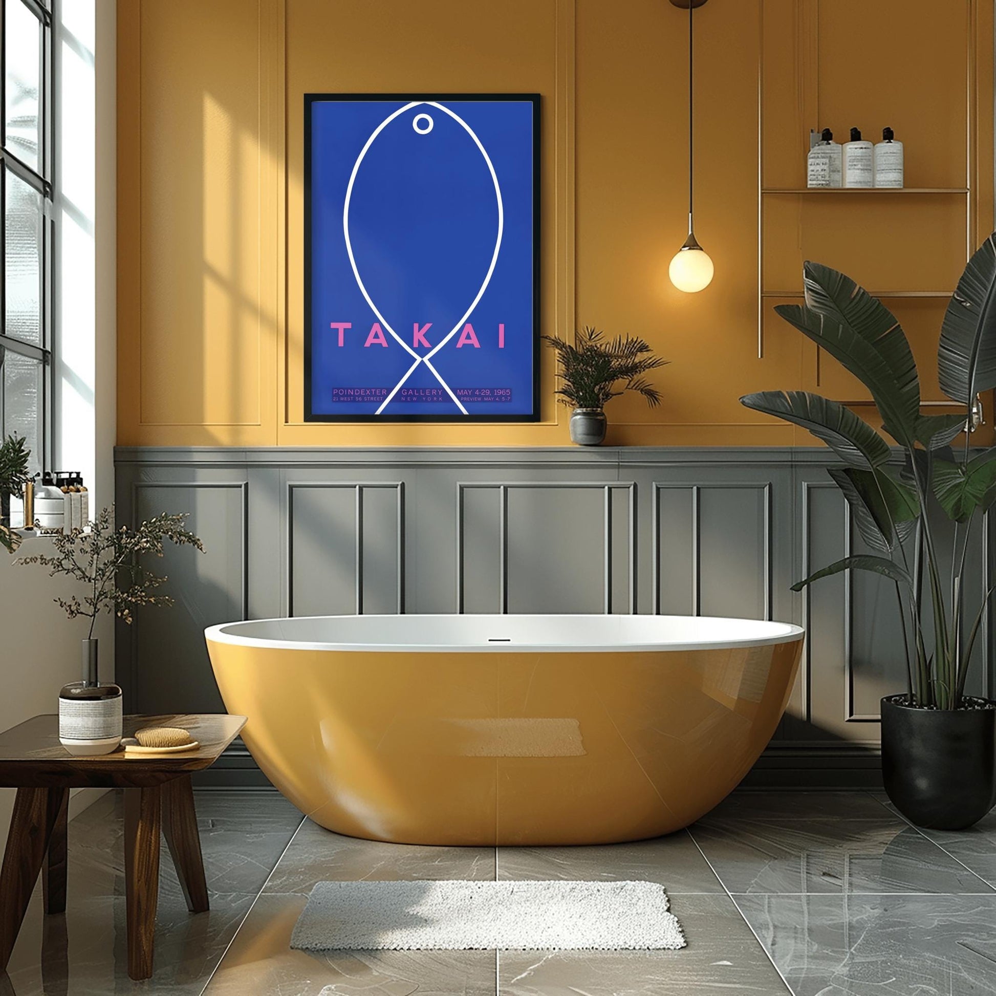 The poster features a bold, minimalist graphic of a white outline forming a stylized fish or fishbone shape, complete with a circular eye, all set against a rich, deep navy blue background. The striking contrast of white against navy, accented by the contemporary pink typography of "TAKAI," creates a truly eye-catching piece. The exhibition details, "POINDEXTER GALLERY NEW YORK MAY 4-29, 1965," are subtly placed at the bottom, adding to its historical art appeal.