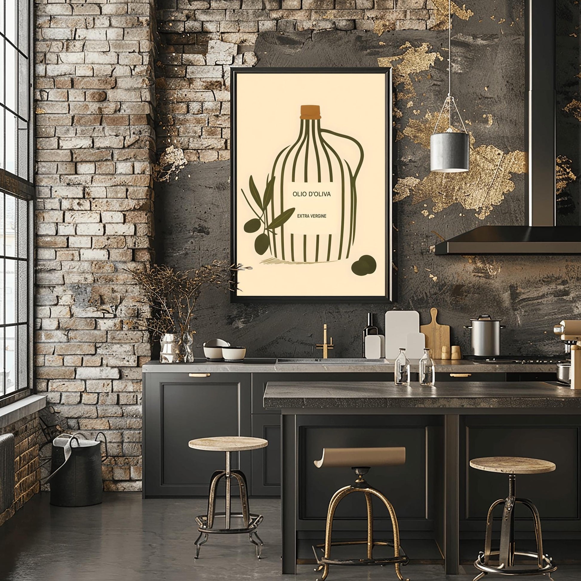 Elevate your kitchen decor with this sophisticated minimalist poster—an olive oil print that brings a touch of Mediterranean art to your space. Featuring a modern food illustration of a classic extra virgin olive bottle, paired with an olive branch, this piece embodies both simplicity and elegance, making it a standout in any italian kitchen art collection. The stylish typography ("OLIO D'OLIVA EXTRA VERGINE") highlights the essence of virgin olive oil and brings an authentic Italian flair to your home.