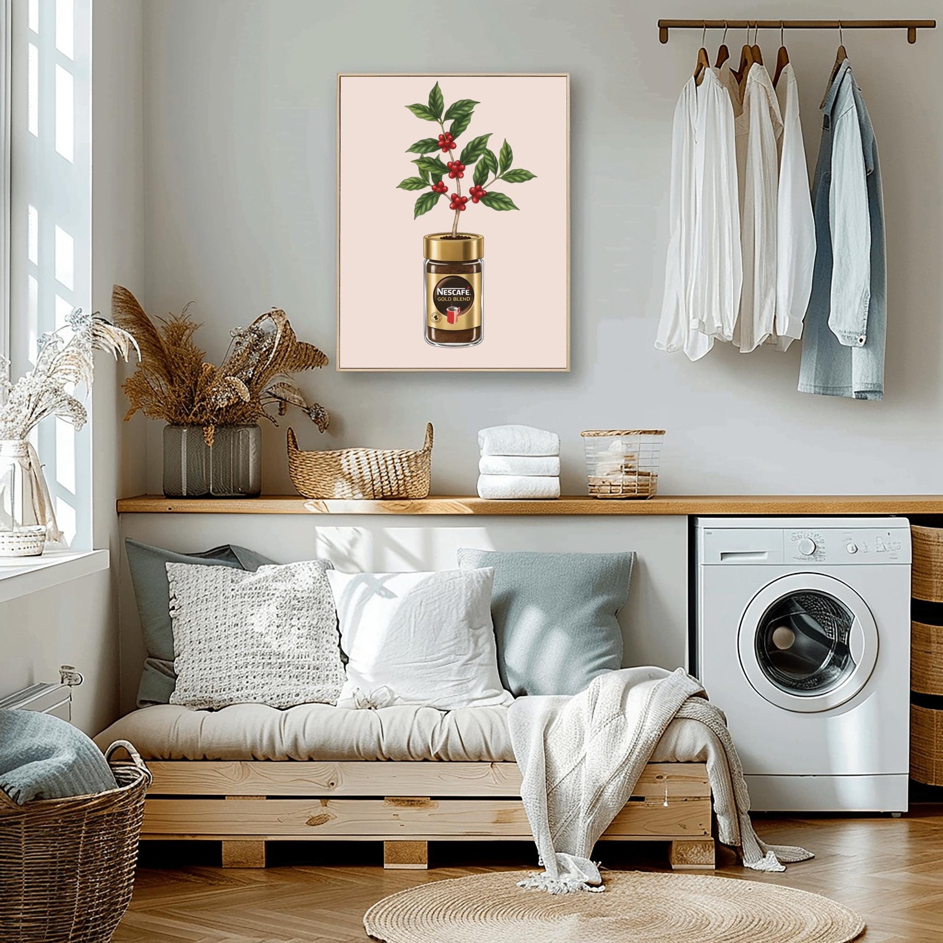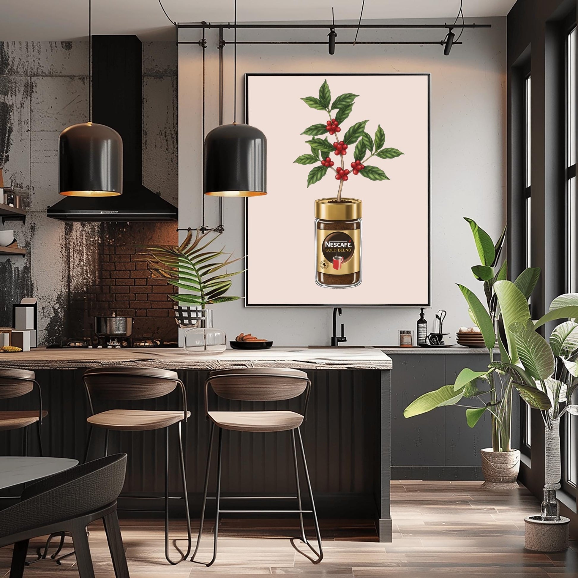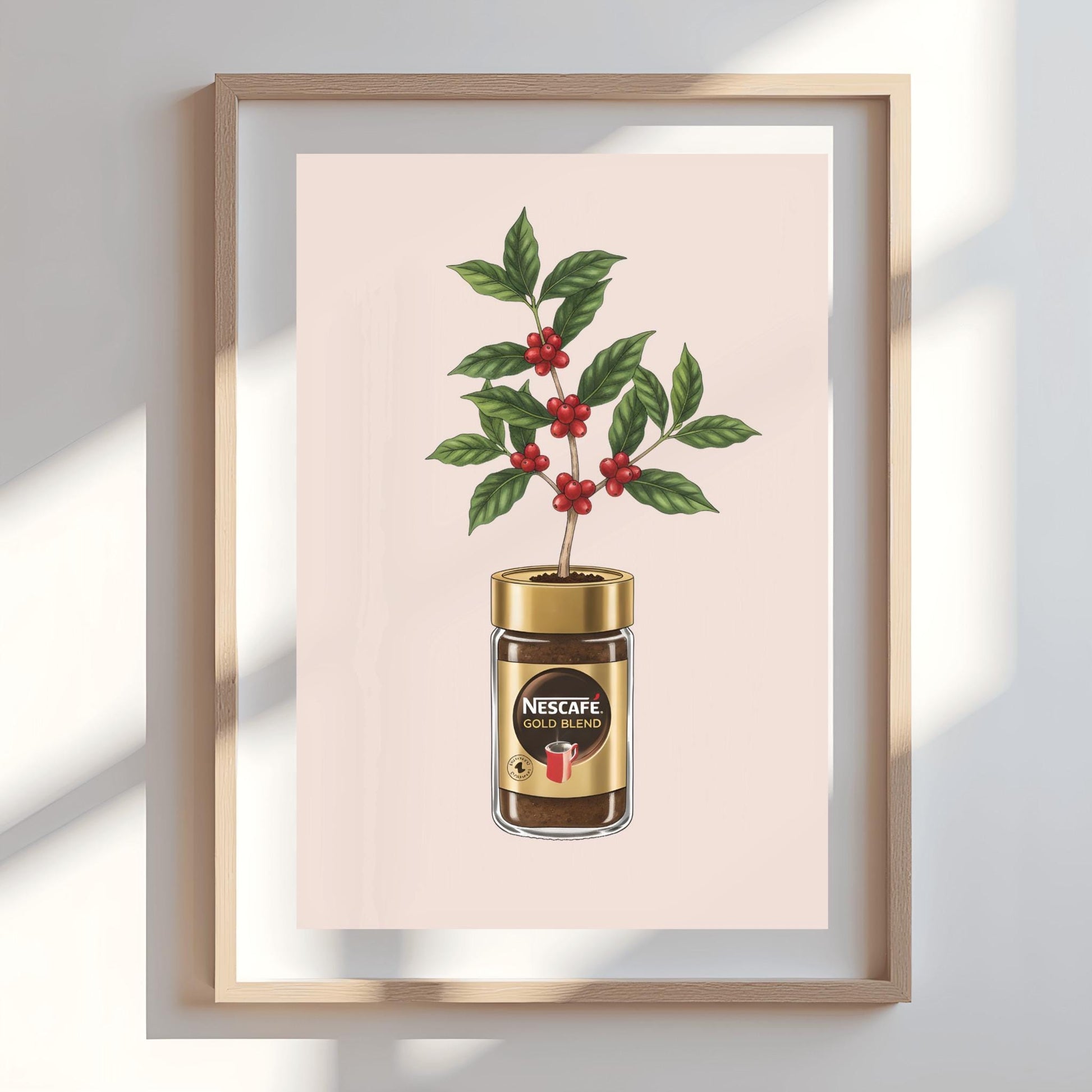 Add a unique and quirky touch to your home with this charming Nescafé Coffee Plant Art Print. This high-quality physical print features a beautifully detailed coffee plant with red berries and lush green leaves, cleverly "growing" out of a classic glass jar of Nescafé Gold Blend. The hand-drawn illustration style gives it a whimsical and fresh feel, blending botanical art with a common household item.This captivating print is ideal for:Coffee Lovers: A perfect and unique gift for anyone who appreciates a good cup of coffee.Quirky Kitchen Decor: This piece is great for adding personality and a touch of humor to a kitchen, dining room, or coffee nook.Unique Gifts: A thoughtful and charming present for a housewarming, birthday, or any special occasion.Printed on premium, durable paper, this physical print is ready to be framed and will become a standout piece of your home decor.Features:High-Quality Physical Print: A vivid, detailed poster ready to be framed and displayed.Unique Design: Combines a familiar product with a botanical illustration for a one-of-a-kind look.Vibrant Colors: The rich reds and greens stand out against the soft, neutral background.Durable Premium Paper: Ensures long-lasting color and detail.Versatile Decor: Perfect for a variety of rooms and decor styles, from modern to eclectic.