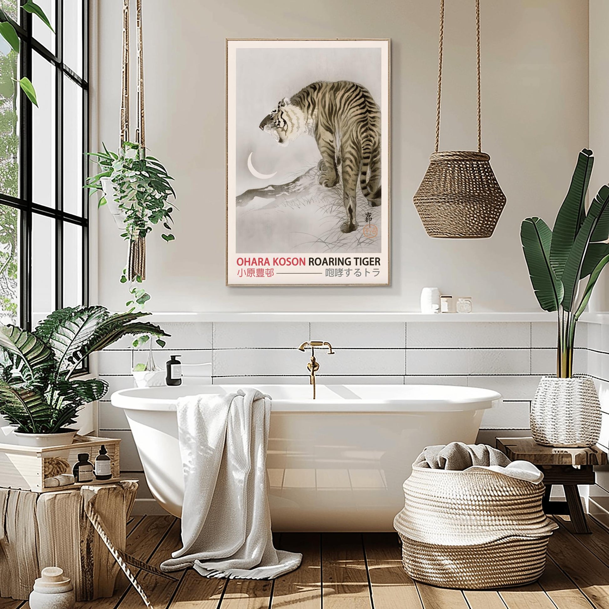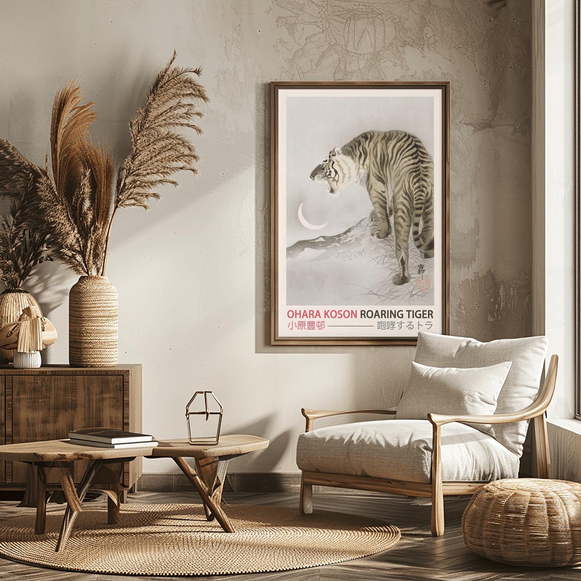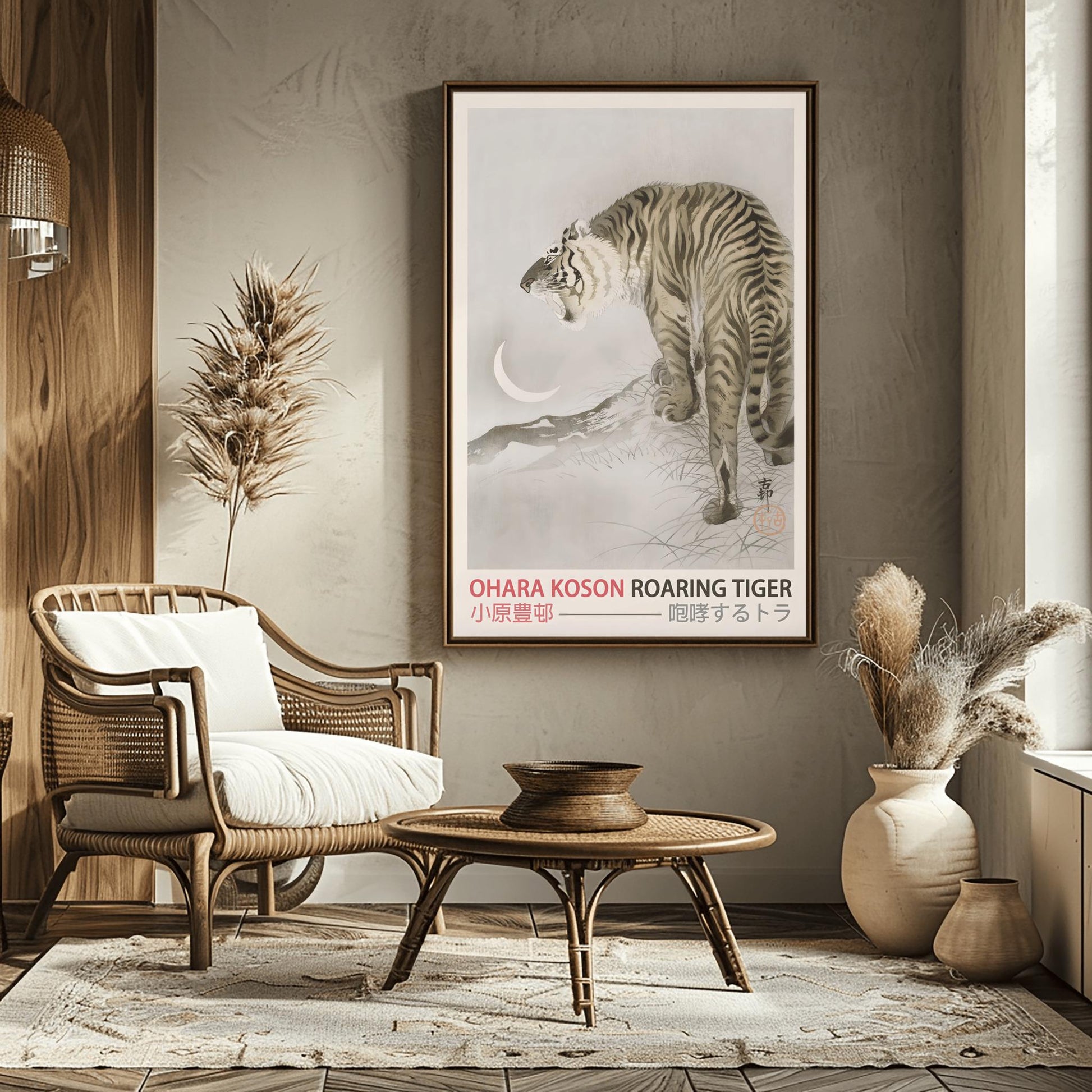 Bring a bold statement to your space with this vintage japanese tiger print, inspired by the iconic work of Ohara Koson. Featuring a roaring tiger, this design blends the beauty of traditional japanese art print with the captivating energy of animal art print. Whether you display it as a standout exhibition poster or a classic poster art print, you’ll add character and a sense of history to your room.