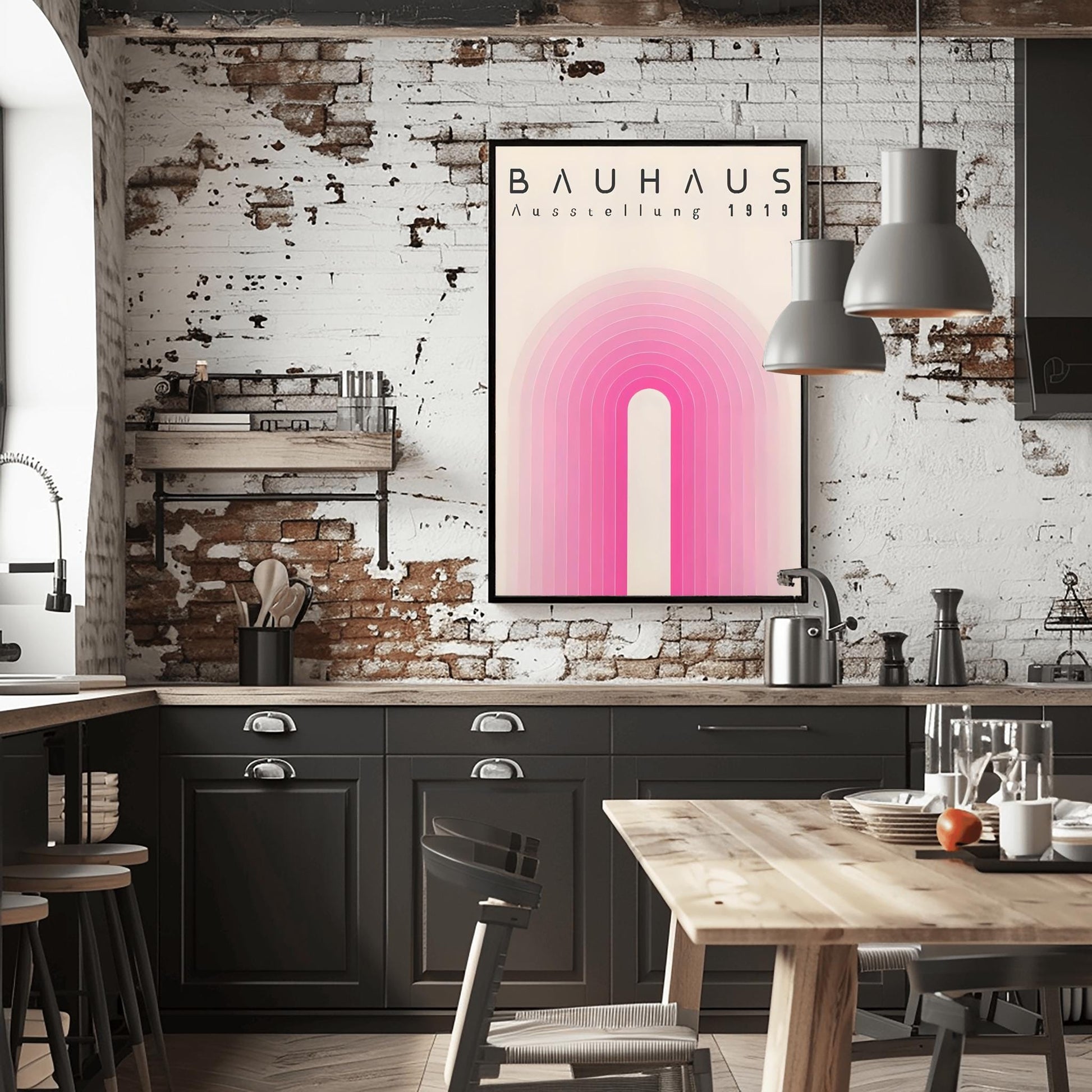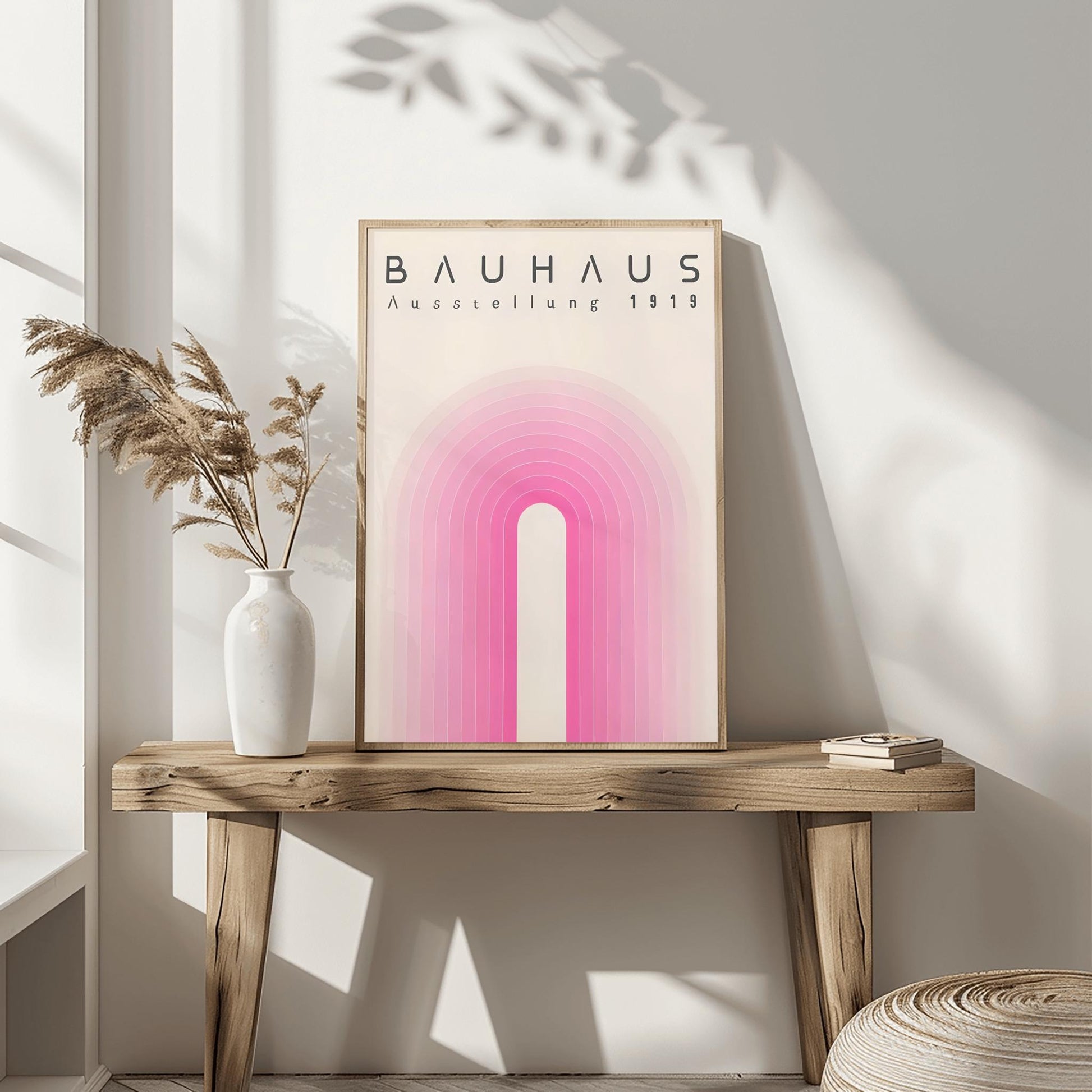 Enhance your aesthetic room decor with this captivating pink Bauhaus poster, a physical reproduction of a classic 1919 exhibition poster. The design features clean geometric art and minimalist typography, capturing the spirit of Bauhaus wall art with a retro vintage funky twist.