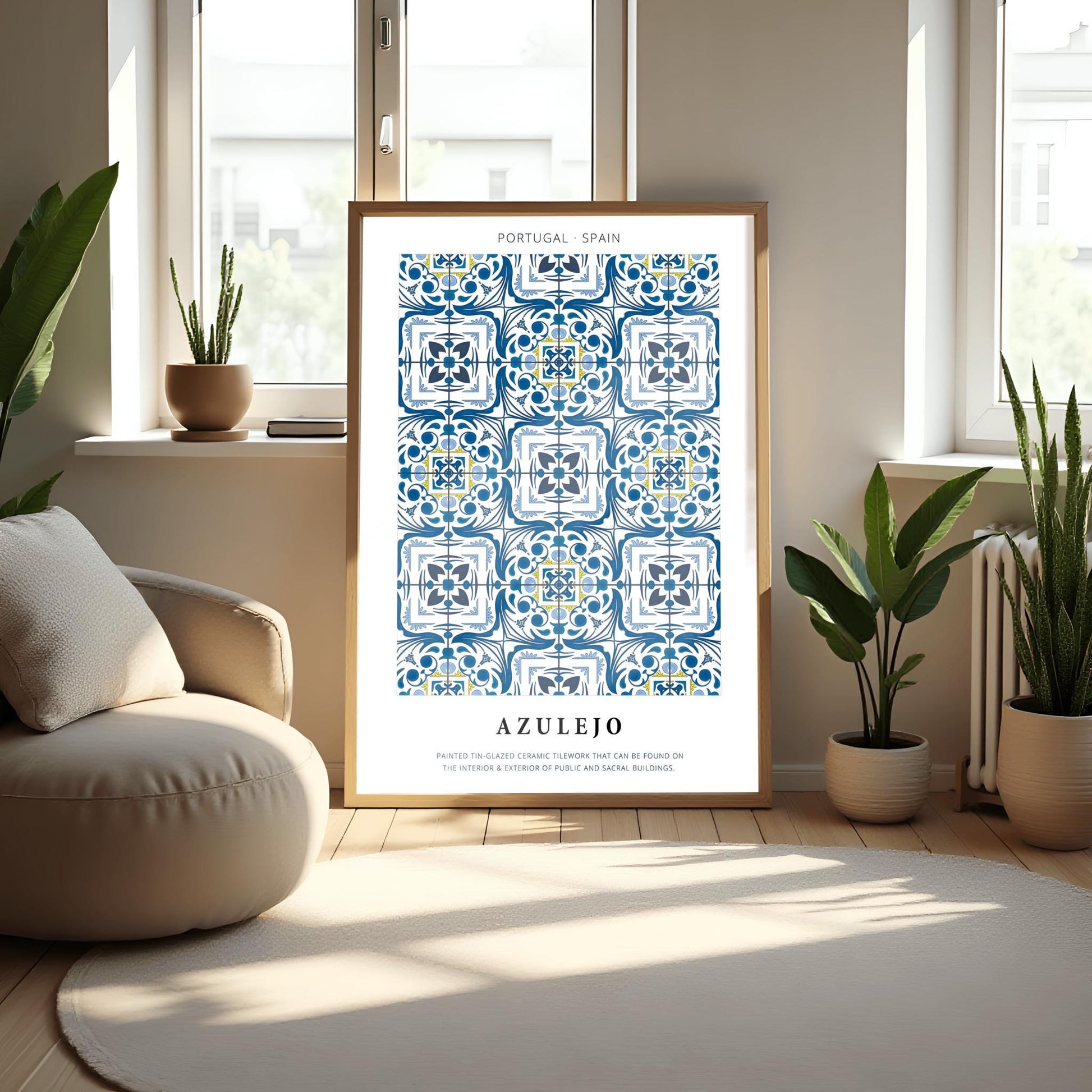 Add a touch of historic beauty to your space with this stunning azulejo poster! This high-quality physical print features a repeating traditional tilework pattern print in classic blue and white with subtle yellow accents. Inspired by iconic Portuguese tile and Spanish tile, this poster celebrates centuries of tile design and craftsmanship from Portugal and Spain art, making it a striking nod to traditional decor.This unique and charming floral tile print is perfect for:Interior Design: Add a beautiful geometric and cultural element to your gallery wall or use as a standalone piece. The blue tile pattern brings timeless style found in portugal art and spain art.Kitchen or Bathroom Decor: The blue and white moroccan tile-inspired pattern is ideal for kitchens or bathroom walls and brings traditional tilework character to your space.Gift Idea: An ideal gift for anyone who loves European art, appreciates history, or has a special connection to Portugal or Spain. It’s a thoughtful way to share the beauty of mediterranean and floral tile print.Printed on premium, durable paper, this physical poster is ready to be framed and will add a unique personality to any interior. The classic tile design and elegant blue tile pattern ensure it will blend effortlessly with many decorating styles.Features:High-Quality Physical Poster Print: Ready to frame and display.Traditional Tilework: Faithful reproduction of a classic blue and white tile design.Mediterranean and Moorish Influence: The pattern print reflects elements of portuguese tile, spanish tile, and moroccan tile, making it perfect for fans of traditional decor.Durable Premium Paper: Designed to keep the blue tile pattern crisp for years.Versatile Decor: Perfect for living rooms, kitchens, offices, and bedrooms.Thoughtful Gift Idea: Suits design lovers and anyone who appreciates cultural portugal art and spain art in their home.