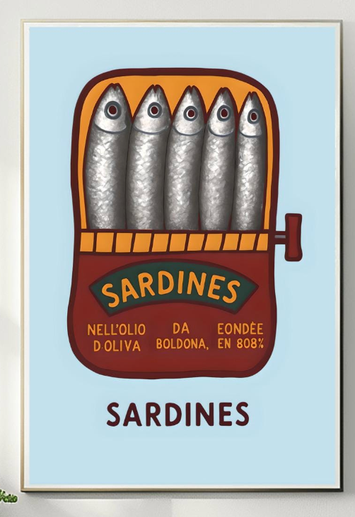 Sardines Hand Drawn Art Print, Retro Tinned Fish Wall Decor, Trendy Seafood Art for Modern Kitchen or Coastal Gallery
