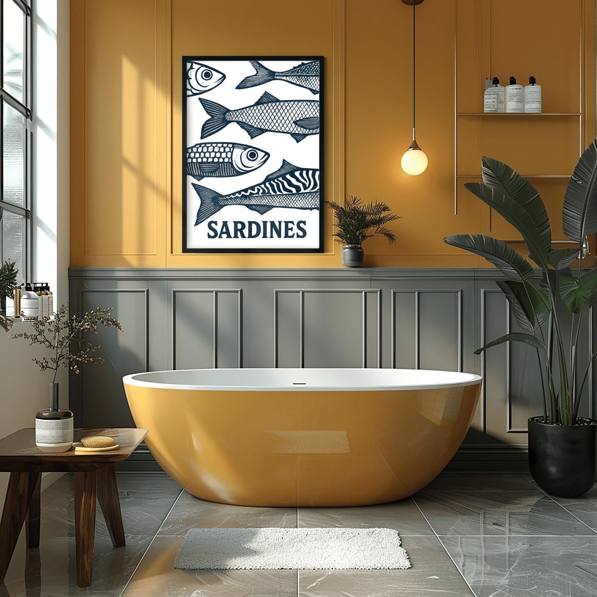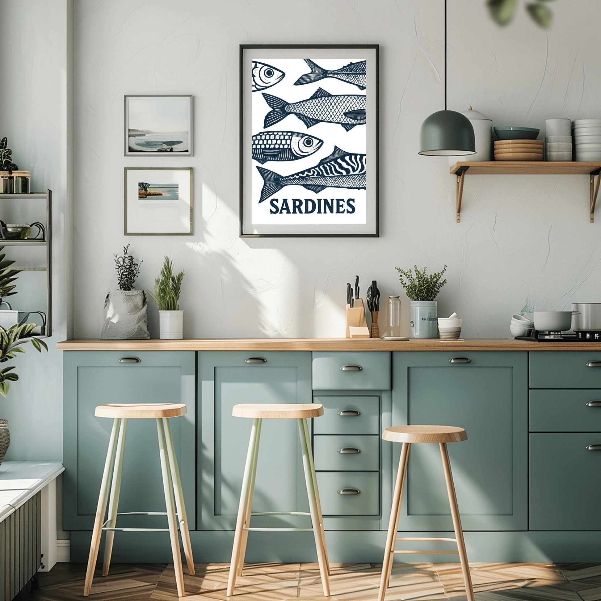 Update your retro wall art or kitchen wall art collection with this eye-catching sardines poster today!