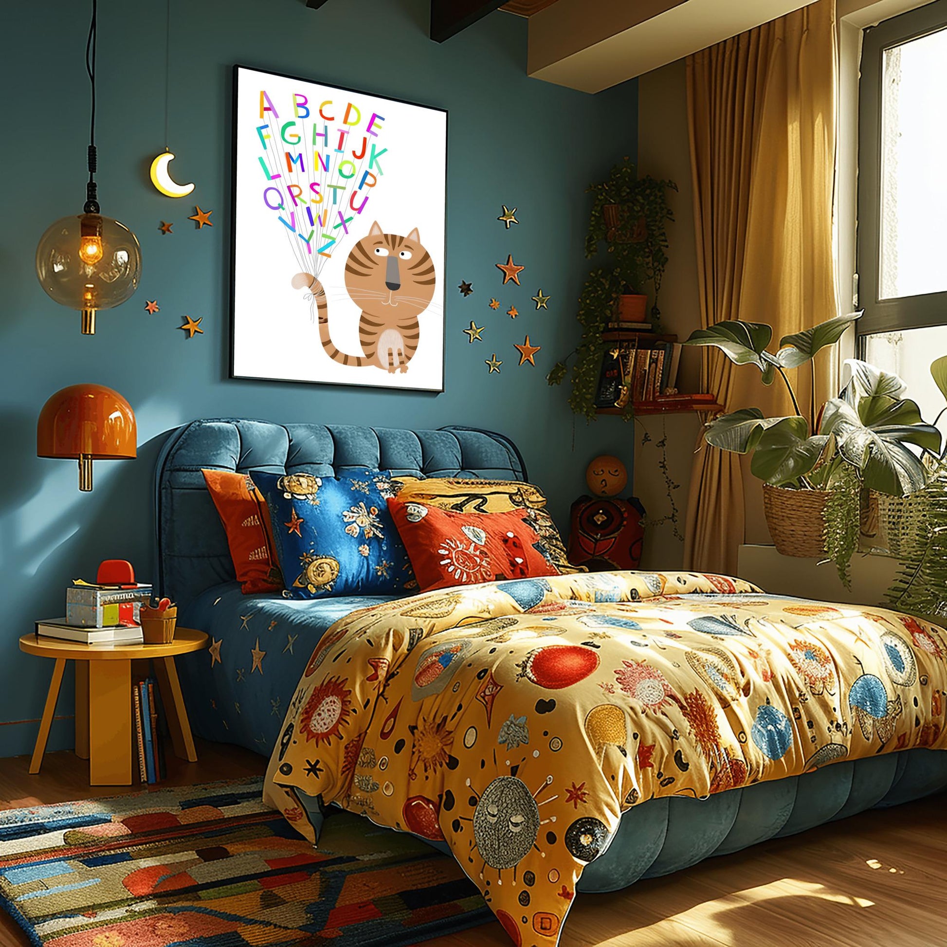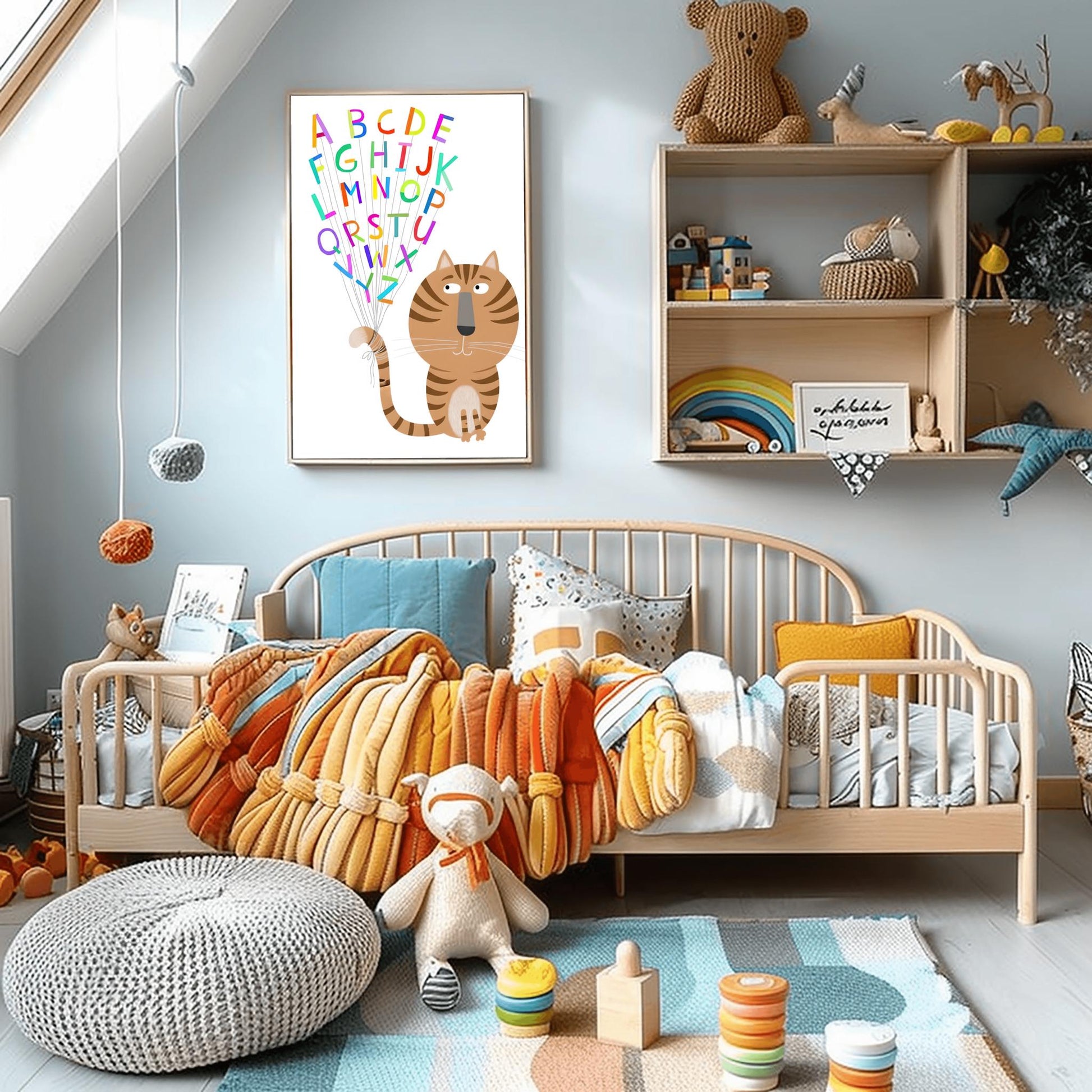 Make learning fun with this incredibly cute ABC Alphabet Cat Print! This high-quality physical print features a charming tabby cat holding onto the entire alphabet, with each letter floating like a brightly colored balloon.The whimsical style and bold colors are designed to capture a child's attention, making it a delightful way to introduce the alphabet and add personality to any space. It's a wonderful piece of functional art for both modern and traditional kids' rooms.This print is ideal for:Nurseries and Playrooms: Adds a playful, educational, and colorful touch to a child's space.Baby Shower Gifts: A unique and thoughtful gift for new parents.School & Daycare Decor: Perfect for classrooms or play areas.Printed on premium, durable paper, this physical print is ready for framing and will brighten up any wall.Features:High-Quality Physical Print: A vivid, detailed poster ready to be framed and displayed.Whimsical and Cute Design: Features an adorable tabby cat holding colorful, balloon-like letters.Educational & Decorative: Combines fun learning with stylish wall decor.Durable Premium Paper: Ensures long-lasting color and detail.