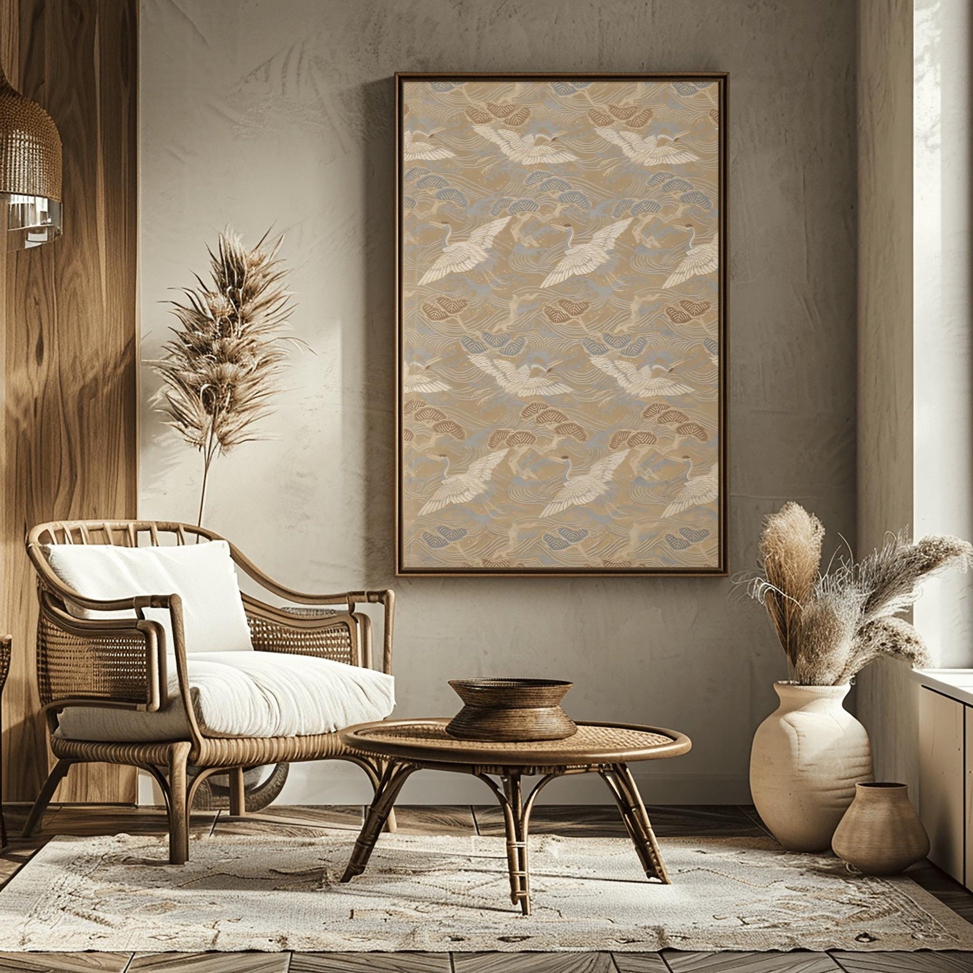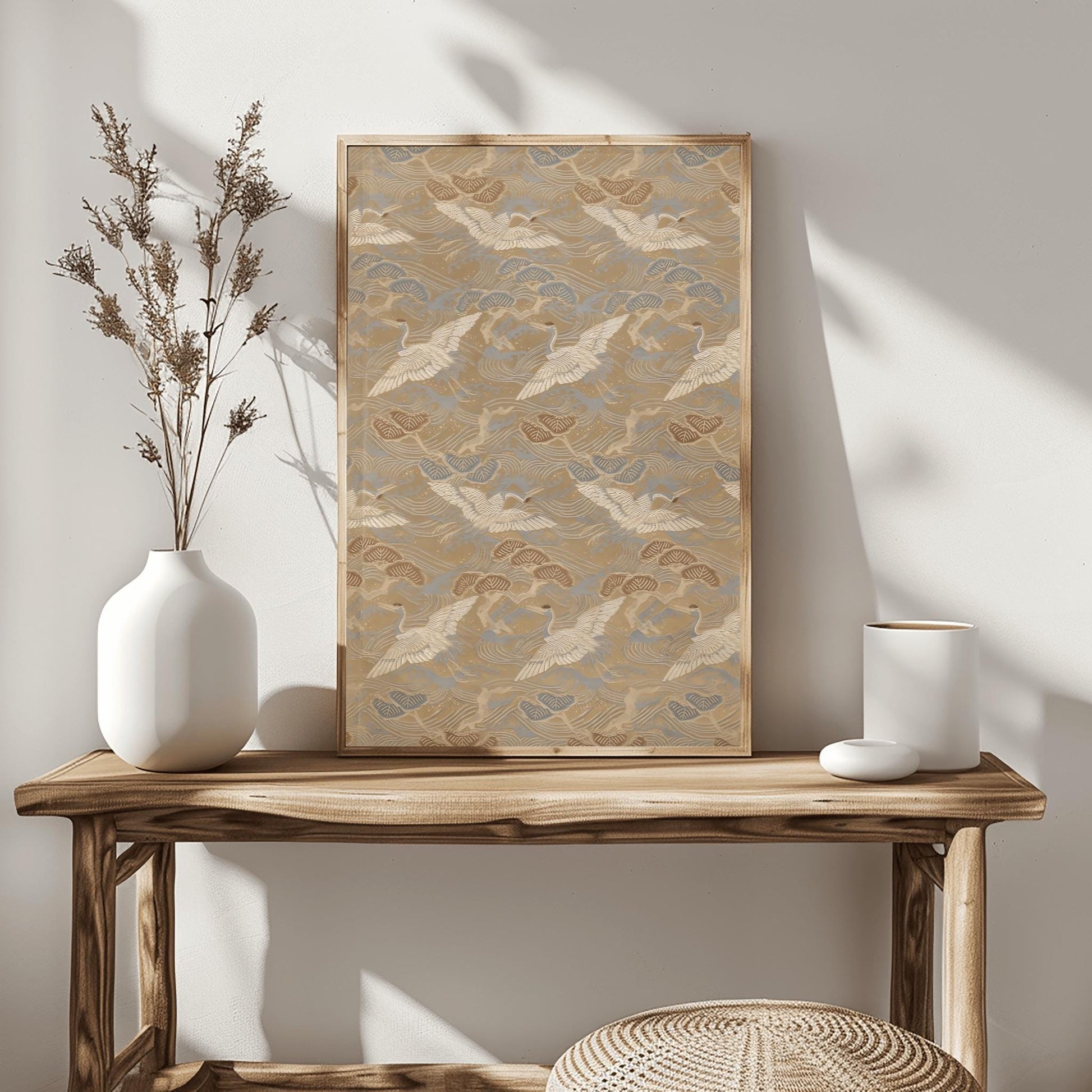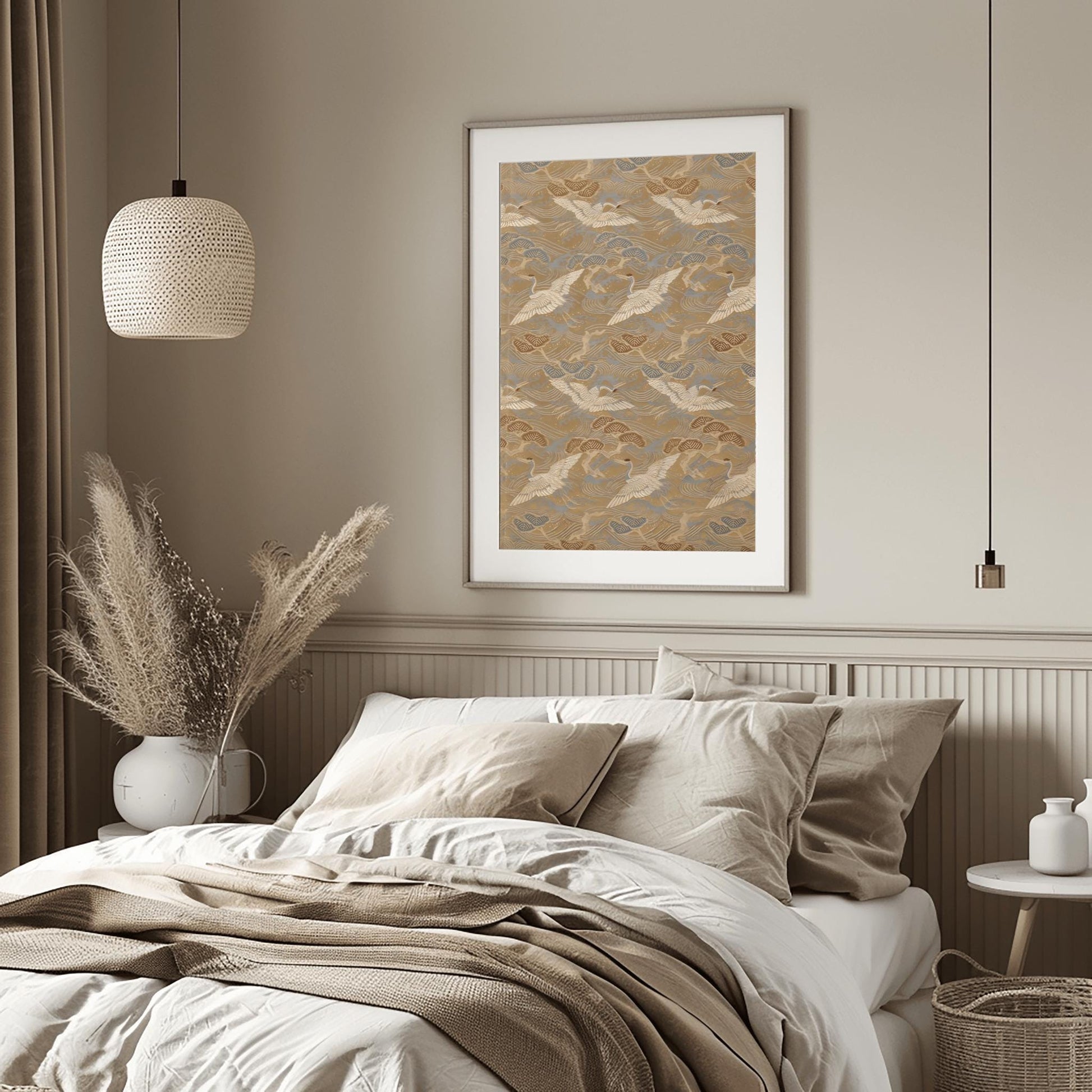 Printed on durable, high-quality poster paper, this wall art print ensures sharp lines and vibrant colors, preserving the fabric design’s intricate details. Its subtle, earthy palette and nature motif make it a perfect addition to your living room, bedroom, study, or dining space, offering a calm and refined touch of Asian decor. If you appreciate traditional japan, hokusai print, and nature-inspired fabric design, this crane print is an excellent way to enhance your home.
