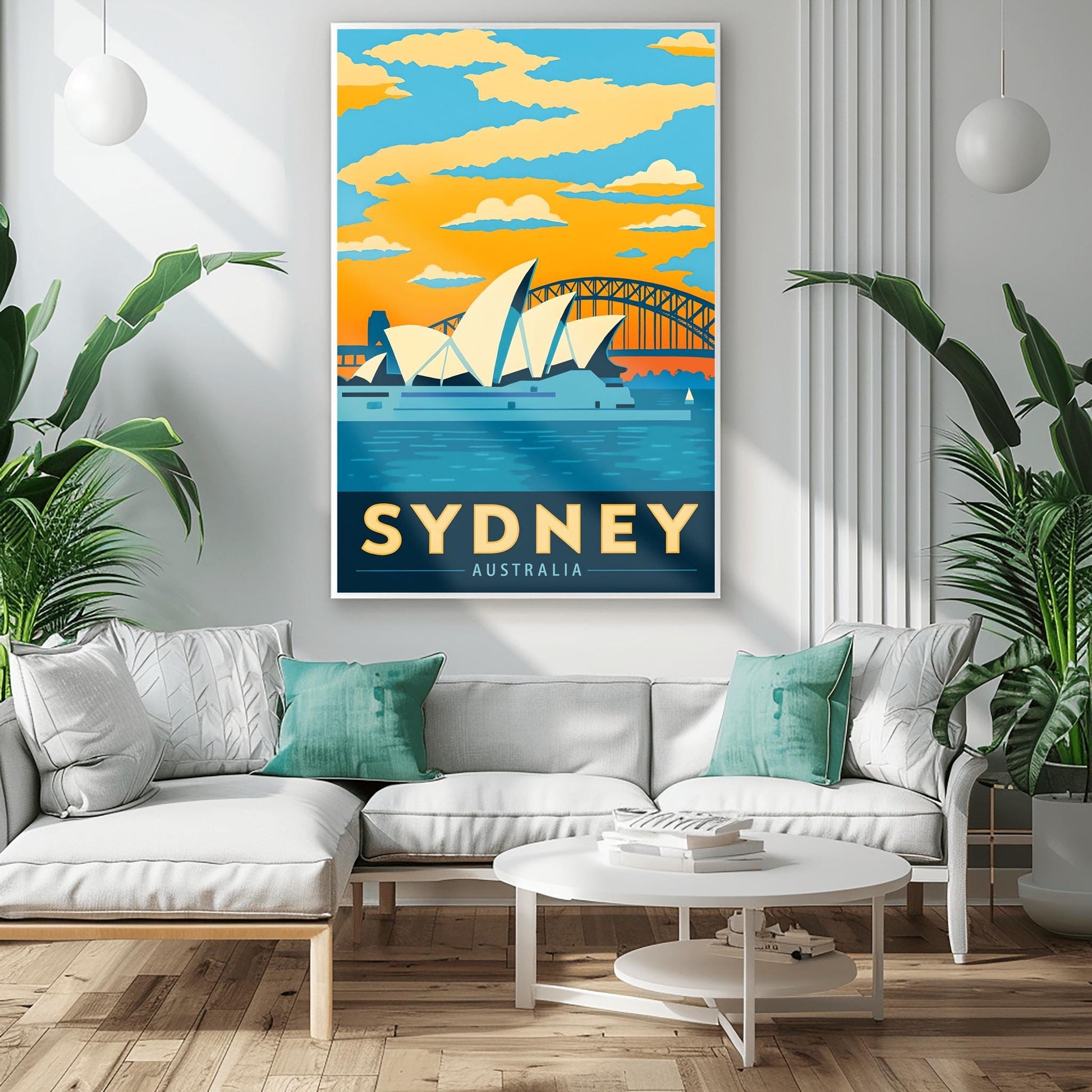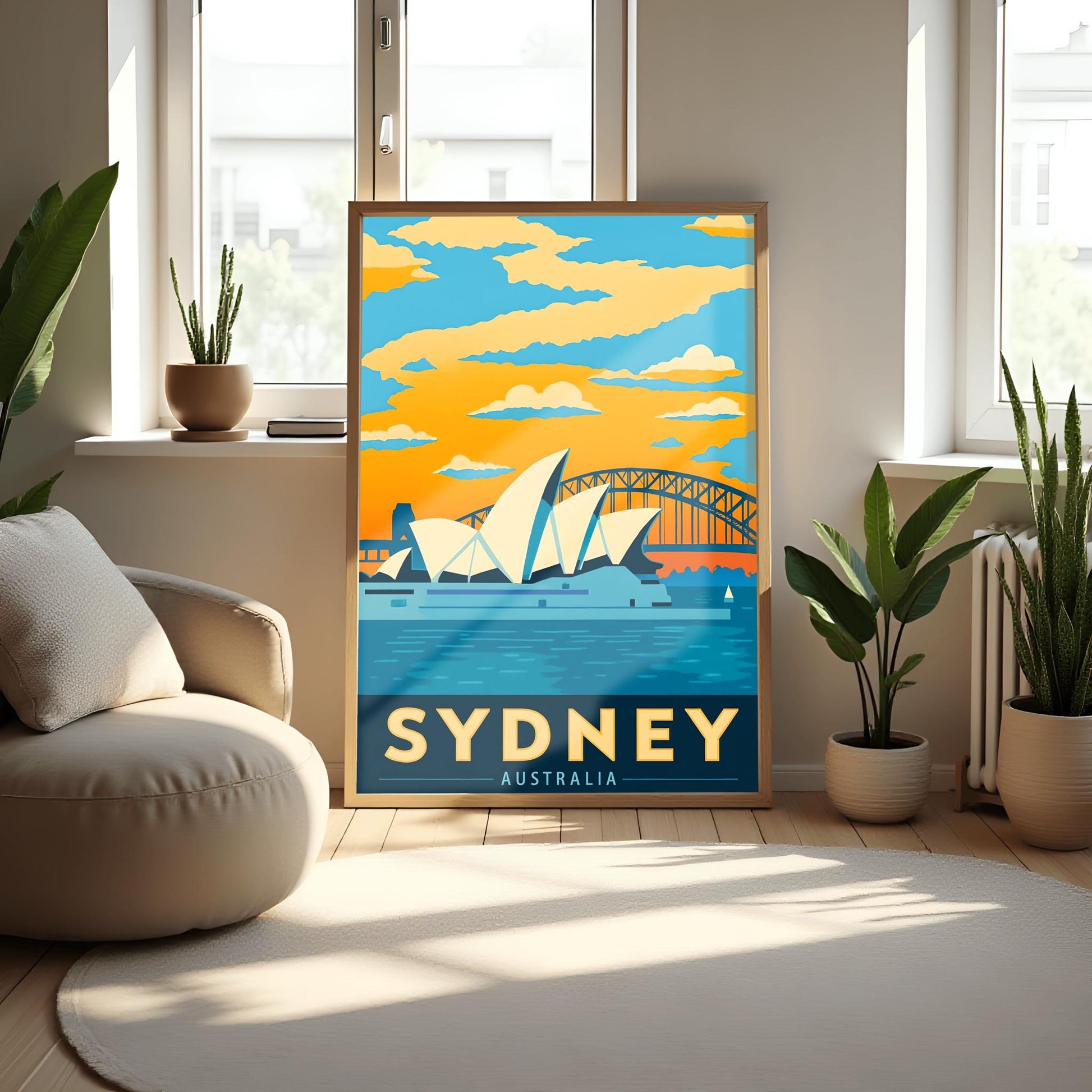 Bring a touch of vintage Australia into your home with this vibrant Sydney poster. Inspired by classic travel advertisements, this high-quality Sydney print captures the city’s iconic beauty with a mid-century modern twist. You'll see the world-famous Sydney Opera House as the centerpiece—perfect for anyone who appreciates opera house art and architectural landmarks. The Harbour Bridge print and city skyline appear behind, together creating a nostalgic yet fresh sydney art print.The bold palette of deep blue, orange, and off-white evokes timeless sydney harbour art and a sense of adventure in Oceania art style. Clouds and a stylized sky give this sydney travel poster a feeling of perpetual sunshine native to the Australian coast.Printed on durable, premium paper, this sydney wall art is ready to frame and display anywhere for an instant update to your decor. Whether you're looking for an australian gift, sydney souvenir, or an australian souvenir to remember your travels, this piece makes it easy to bring a piece of Down Under into your space.Features:- High-Quality Physical Poster Print: A classic sydney print you can easily frame and display.