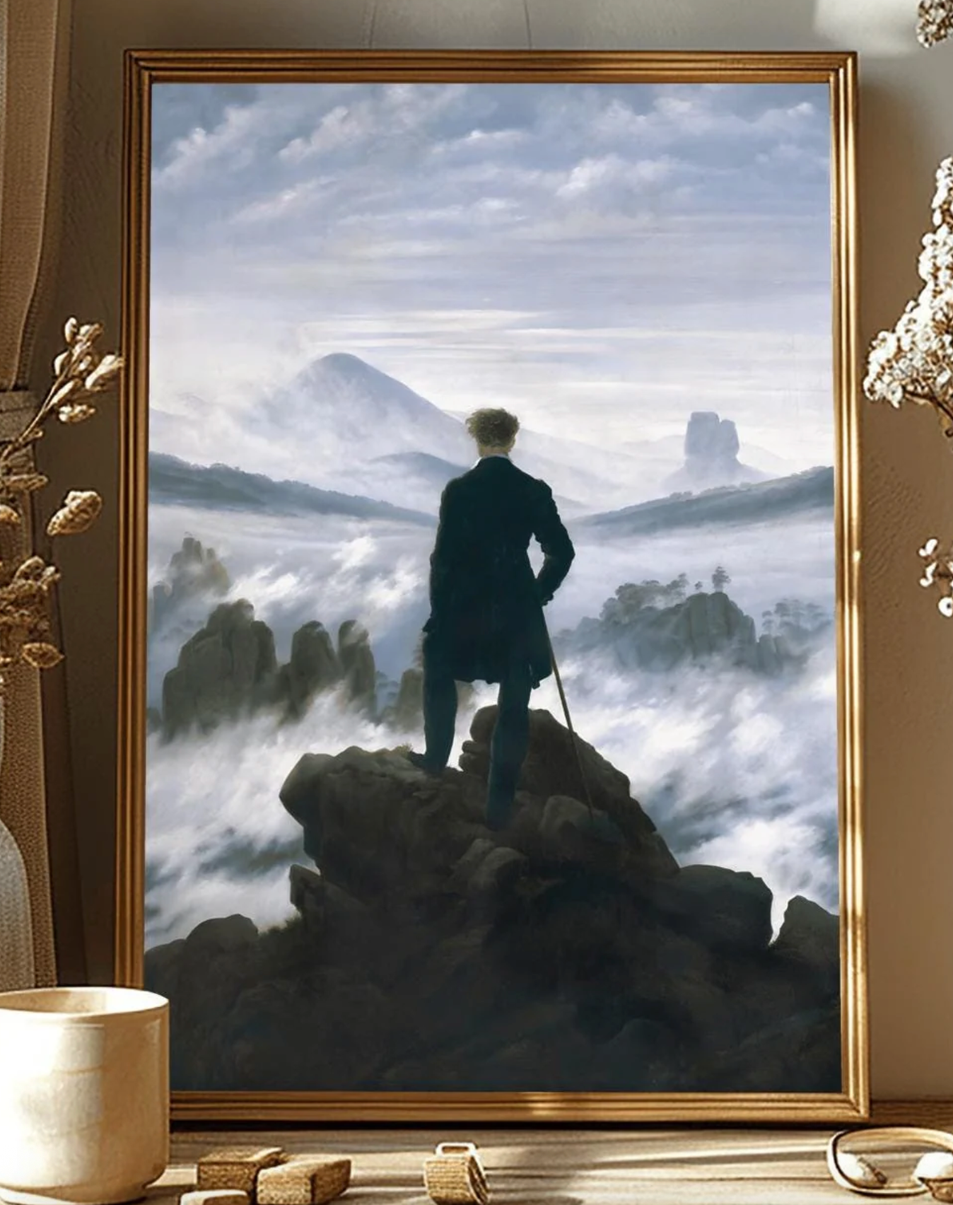 Bring a touch of contemplative art and moody wall decor to your space with this physical giclee poster print of Caspar Friedrich’s classic painting, "Wanderer Above the Sea of Fog." This famous art print captures the essence of romanticism art and is known as one of the most iconic landscape prints from the era. The mountain view art and dramatic atmosphere make this Friedrich poster a striking example for lovers of dark academia art, gothic art print styles, and those seeking something unique for their home.