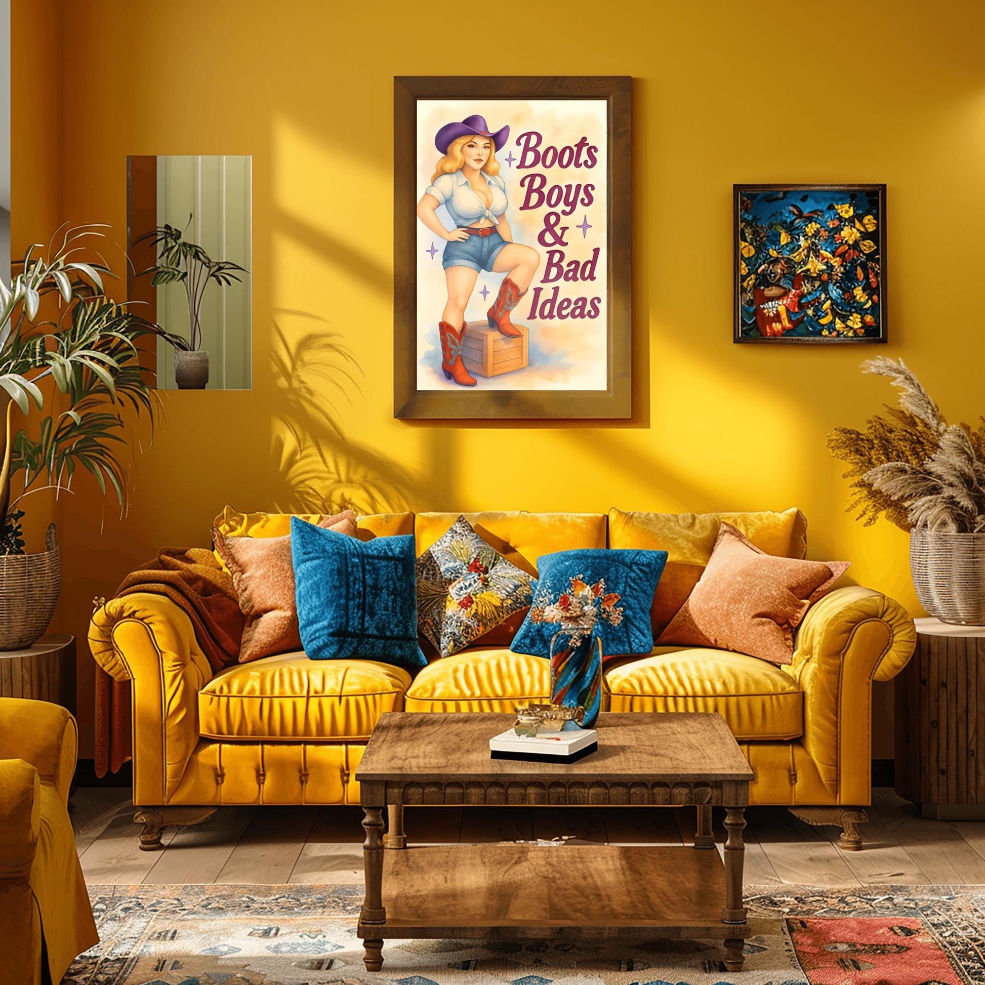 Unleash your inner cowgirl with this vibrant western wall art featuring a retro pin up girl print with classic cowboy boots decor! This captivating physical poster is a must-have for fans of southwestern art, bringing bold personality to your farmhouse wall art, boho western art, or americana art collection. It also makes a unique gift idea for anyone who loves rustic decor and cowgirl decor.
