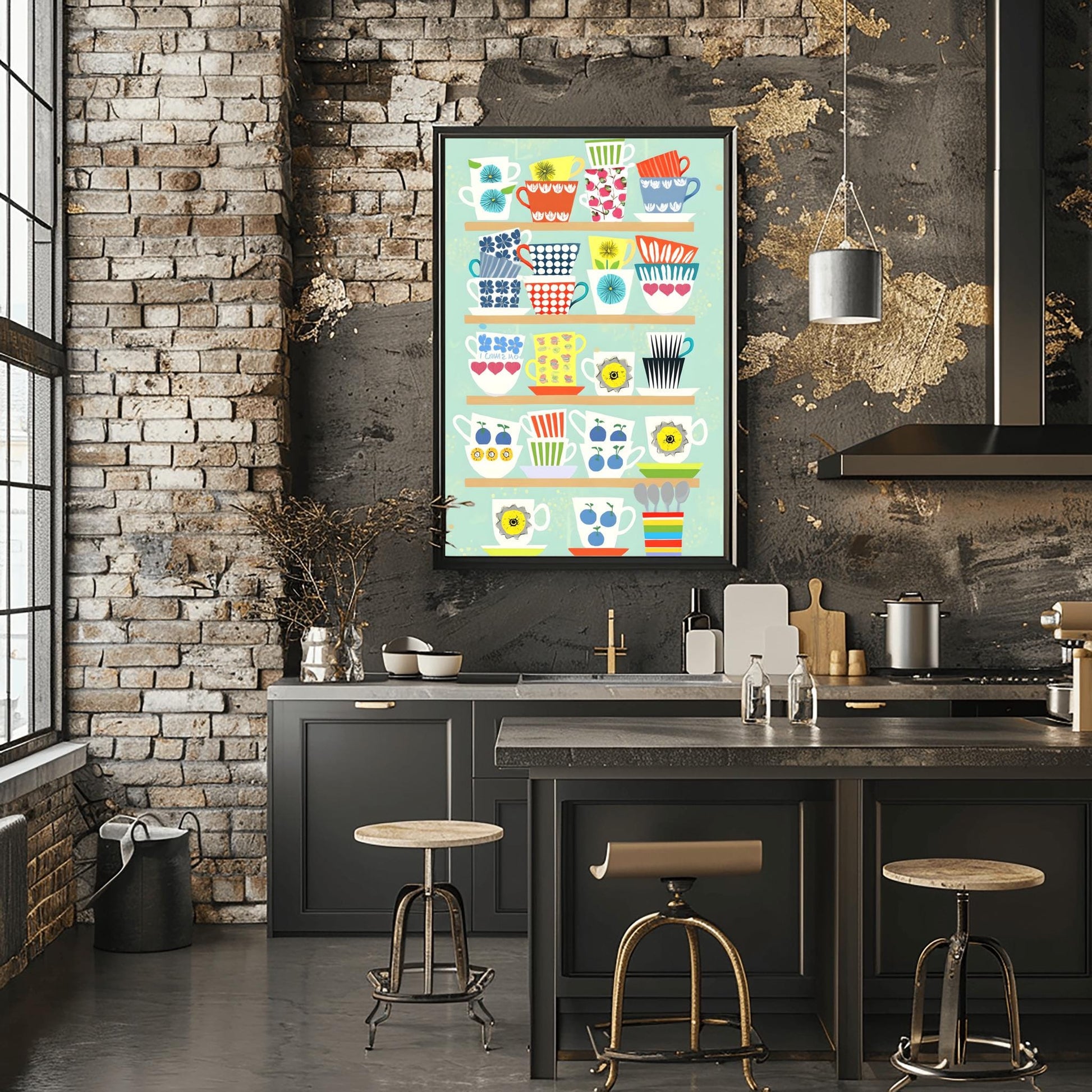 Brighten up your space with this delightful whimsical teacups art print, designed to bring charm to any retro kitchen or vintage kitchen setting. This poster features a hand-drawn teacup illustration, showcasing an eclectic collection of colorful mugs inspired by mid-century art and classic kitchen wall art styles. With a cheerful palette and playful details, this physical print fits right into your kitchen, breakfast nook, or as vibrant cafe decor.