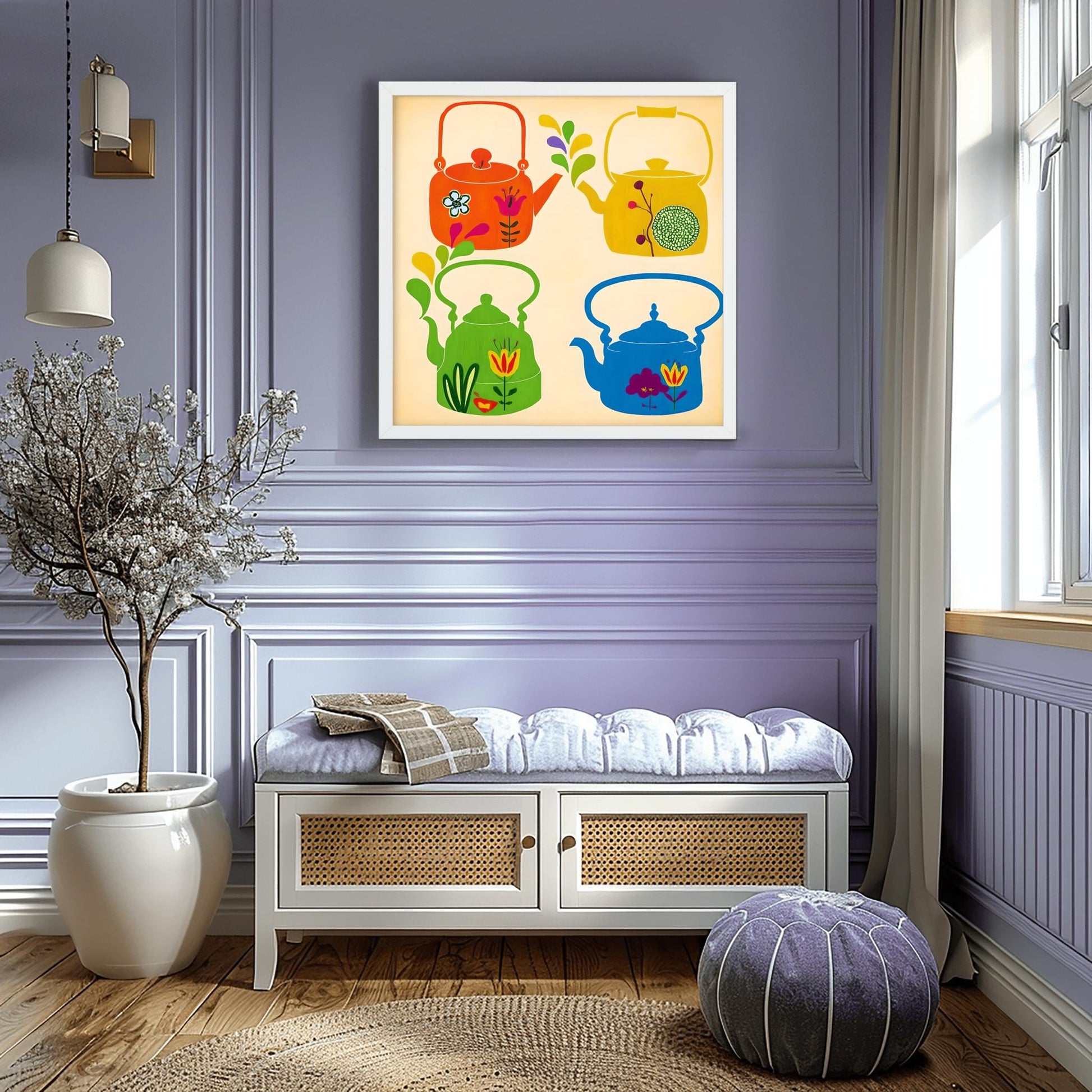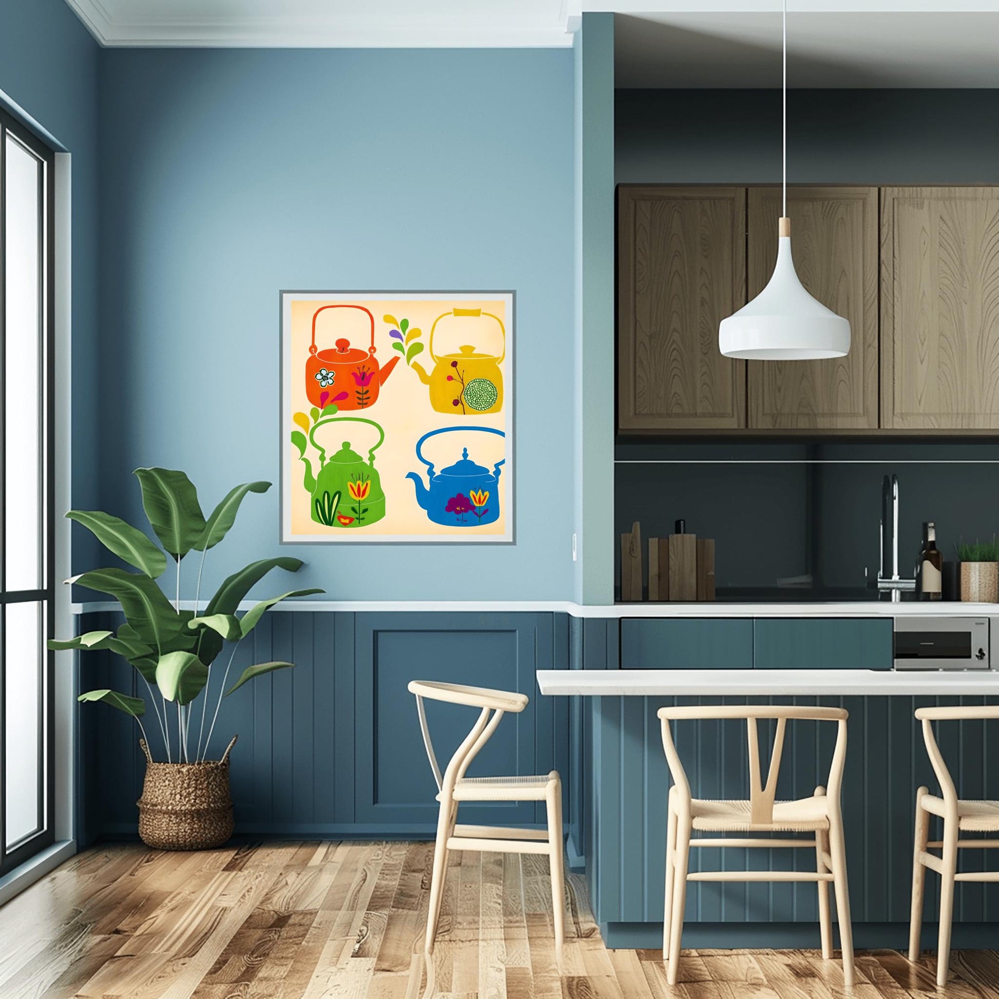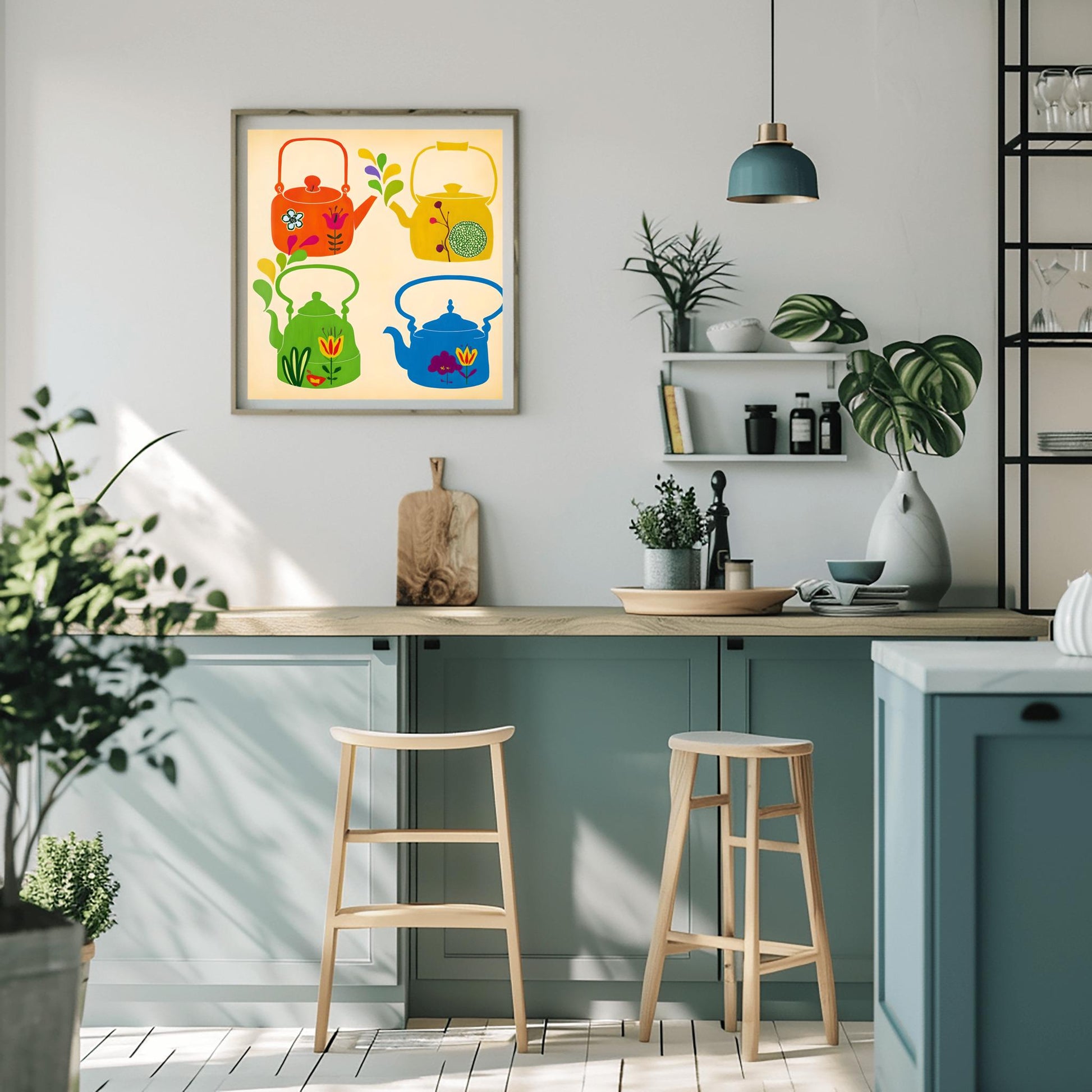 Add a splash of color and whimsy to your space with this whimsical teapot art print, perfect for enhancing any retro kitchen. This poster features a delightful folk art print of four unique teapots, each rendered in a vibrant, colorful art style with detailed teapot illustration and decorative patterns. The design blends vintage style with a touch of cottagecore decor, making it a standout piece of kitchen wall art for tea and coffee lovers alike.The print showcases a playful arrangement:The teapot poster displays four whimsical teapots in a 2x2 grid, each with its own distinct personality, capturing the essence of a humorous tea set.Each teapot illustration is colored orange, yellow, green, and blue, with charming floral and abstract folk art elements for extra visual interest.The lively, bright designs create a cheerful, inviting vibe in any kitchen, breakfast nook, or coffee bar, making this a perfect choice for both coffee art collectors and tea enthusiasts.Printed on high-quality, durable poster paper, this teapot poster is ready to frame and brings a pop of vintage style and colorful cottagecore decor to any room. It makes an ideal tea lover gift, coffee lover treat, or unique housewarming present for anyone who appreciates fun, colorful art for their home.Features:High-Quality Physical Poster Print: Ready to frame and add to your kitchen wall art collection.Whimsical Teapot Design: Includes four unique and vibrant teapot illustrations in classic folk art style.Cheerful Color Palette: Features bright orange, yellow, green, and blue hues on a light background.Durable Premium Paper: Preserves rich detail and color for lasting enjoyment.Versatile Decor: Complements retro kitchen spaces, dining rooms, or cottagecore decor.Thoughtful Gift Idea: The perfect tea lover gift, or a creative pick for any coffee lover wanting to add more coffee art and whimsical teapots to their home.