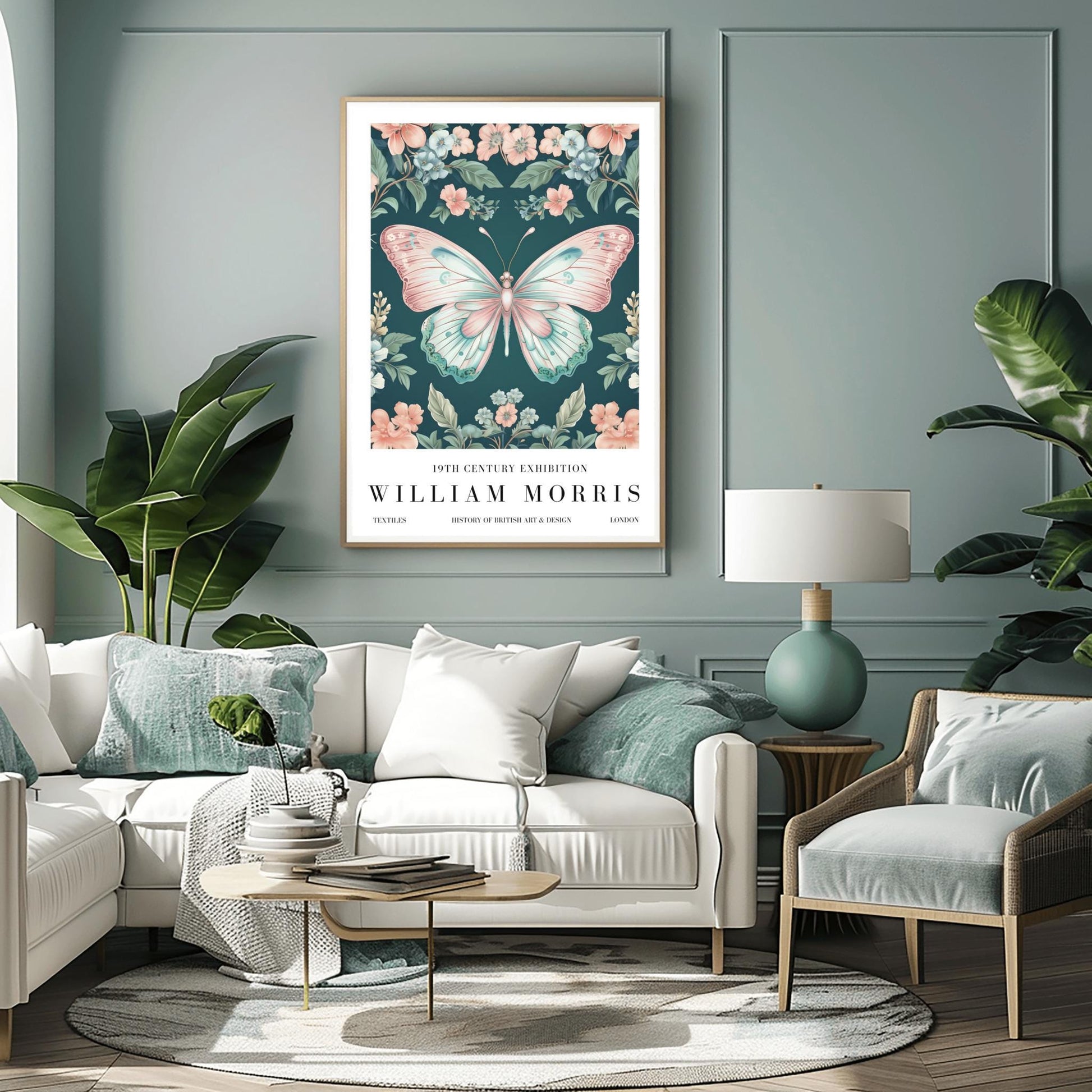 Bring a touch of classic artistry and natural beauty to your home with this stunning William Morris Exhibition Poster print. This high-quality physical print is a tribute to the artistry of the 19th-century British designer, featuring a charming butterfly with delicate pink and blue wings. The butterfly is surrounded by a backdrop of intricate floral patterns in shades of pink, peach, and blue on a dark background. The design, reminiscent of his iconic cotton prints, is a perfect blend of elegance and natural motifs.This captivating print is ideal for:Art History Enthusiasts: A must-have for anyone who appreciates the works of William Morris and the Arts and Crafts movement.Classic or Maximalist Decor: The rich colors and intricate details are perfect for adding a touch of vintage elegance to a living room, bedroom, or office.Unique Gifts: A thoughtful present for a friend or family member who loves fine art, nature, and storytelling.Printed on premium, durable paper, this physical print is ready to be framed and will become a stunning focal point in your home.Features:High-Quality Physical Print: A vivid, detailed poster ready to be framed and displayed.Iconic William Morris-inspired Art: Features the renowned style of a master of the Arts and Crafts movement.Intricate and Vibrant Details: Captures the unique and imaginative style of Morris's designs.Durable Premium Paper: Ensures long-lasting color and detail.Versatile Decor: Perfect for a variety of rooms and decor styles, from modern to classic.